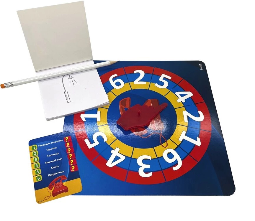 В комплекте: Блокноты - 6 шт. Карандаши - 6 шт., 56 двухсторонних карт, палец-указатель, поле-рулетка.