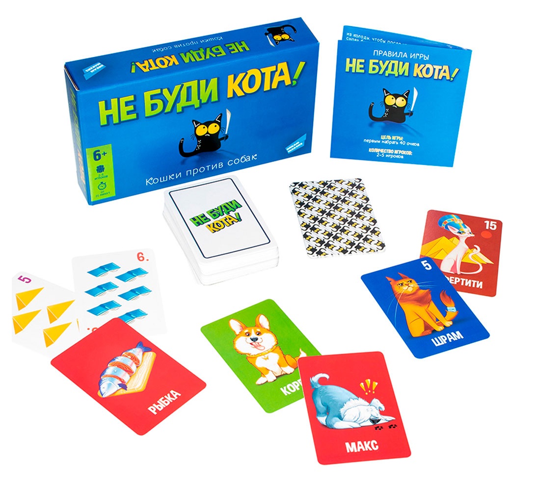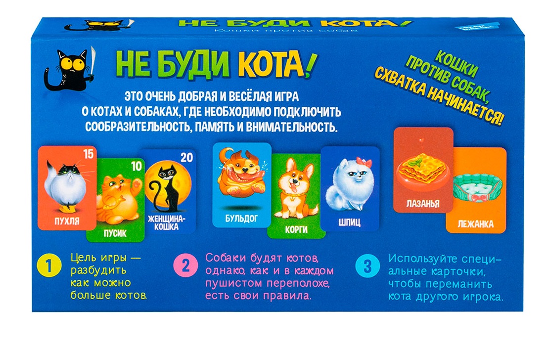 Не буди кота! Это добрая и очень весёлая игра о схватке котов и собак. Для динамичной игры необходимо подключить сообразительность, память и внимательность. Цель игры – это разбудить больше всех котов. Для того, чтобы разбудить кота и заполучить карточку с ним, нужно воспользоваться карточкой с собакой. Однако, как и в каждом пушистом переполохе, есть свои условия. Воспользуйтесь карточкой со специальным лакомством, которое с легкостью сможет похитить пробужденного кота другого игрока. Но и тот не останется в стороне, игрок, кота которого намереваются похитить, может сыграть карточку переноски и защитить его. Если кота другого игрока снова нужно погрузить в глубокий сон сыграйте карточку лежанки, но и тут на ее пути встает пылесос, который не дает коту уснуть. Кошки против собак, схватка начинается! Комплектация: 75 игровых карточек; правила игры.