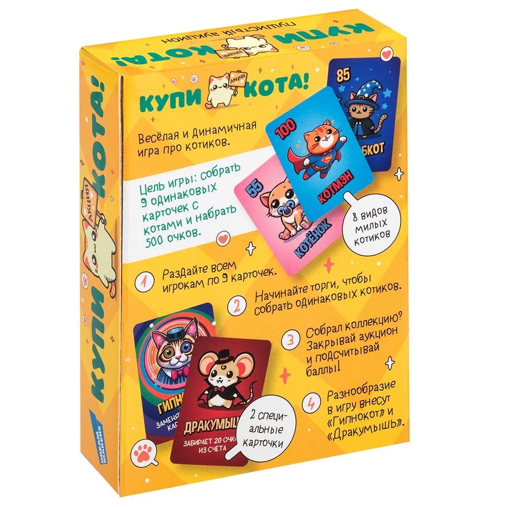 Купи кота - это увлекательная динамичная игра про котиков. Цель игры: собрать 9 одинаковых карточек с котами путём обмена с другими игроками. В коробке вы найдёте 9 видов милых котиков, азнообразие в игру внесут карточки "Дракумышь" и "Гипнокот". В комплект входит: 75 игровых карточек, правила игры.