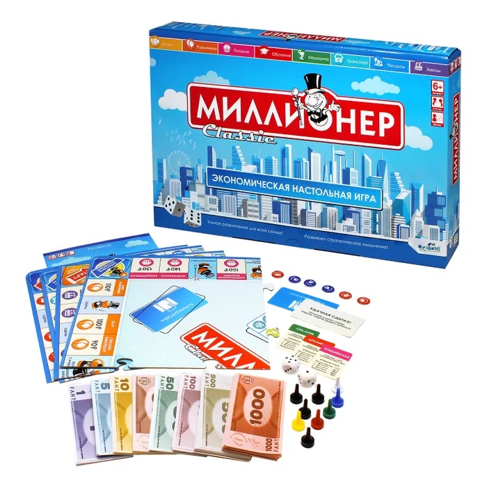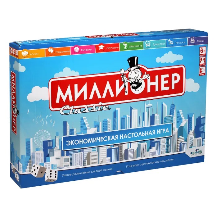 Почувствуйте себя бизнесменом в экономической настольной игре «Миллионер Classic»! Ваша задача: заработать как можно больше и стать успешнее конкурентов. Покупайте и продавайте участки, а также сдавайте их в аренду. Расширяйте свой бизнес – открывайте филиалы и превращайте их в обособленные предприятия. Не забывайте вовремя платить налоги и возвращать долги, иначе банк отберет у вас всё имущество! Сможете ли вы стать монополистом на рынке, разорив остальных игроков, или станете банкротом сами? Игра развивает стратегическое мышление, учит анализировать и планировать. Идеально подходит для уютных семейных вечеров и посиделок с друзьями!