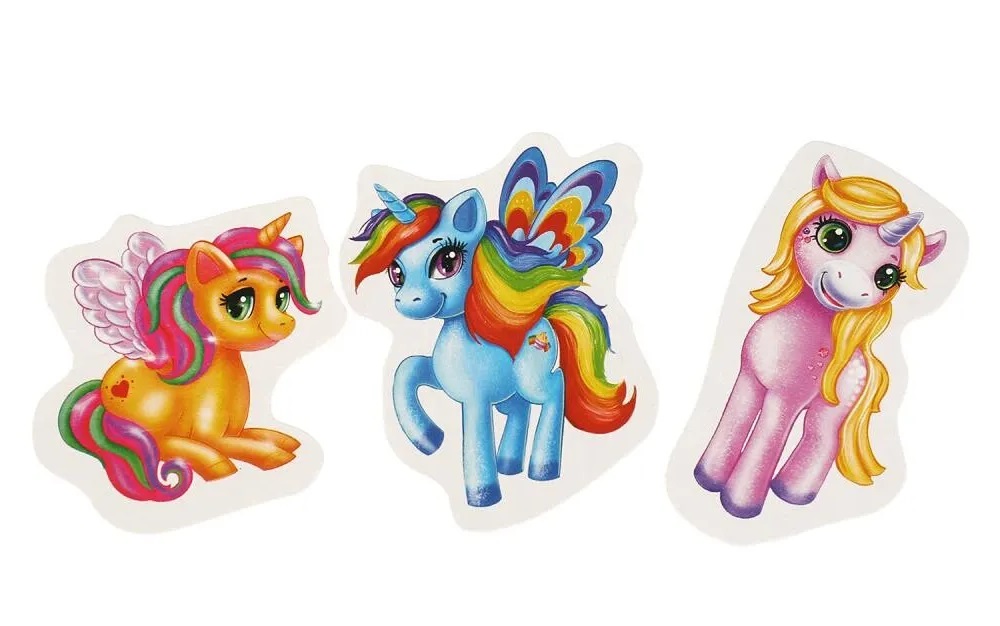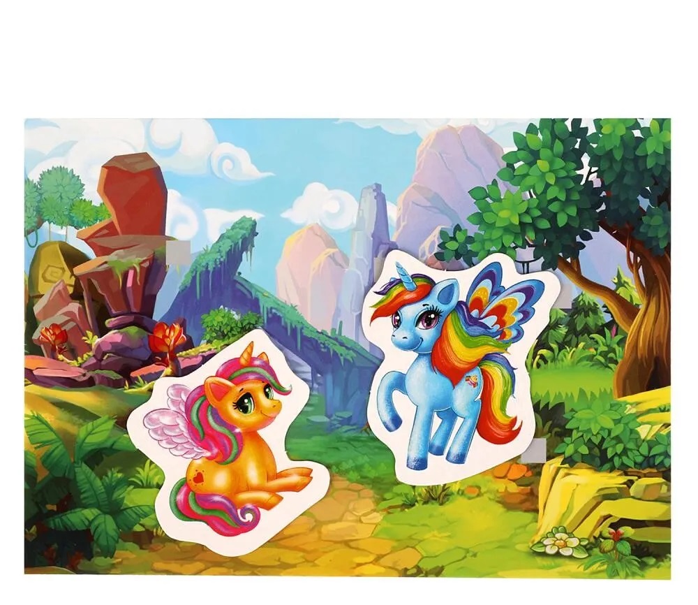 В процессе игры ребенок должен найти для каждого персонажа свое место на карточке и прикрепить его на липучку. Малыш может экспериментировать и размещать фигурки очаровательных единорогов на разных карточках, причем многократно - липучки очень крепкие и надежные.