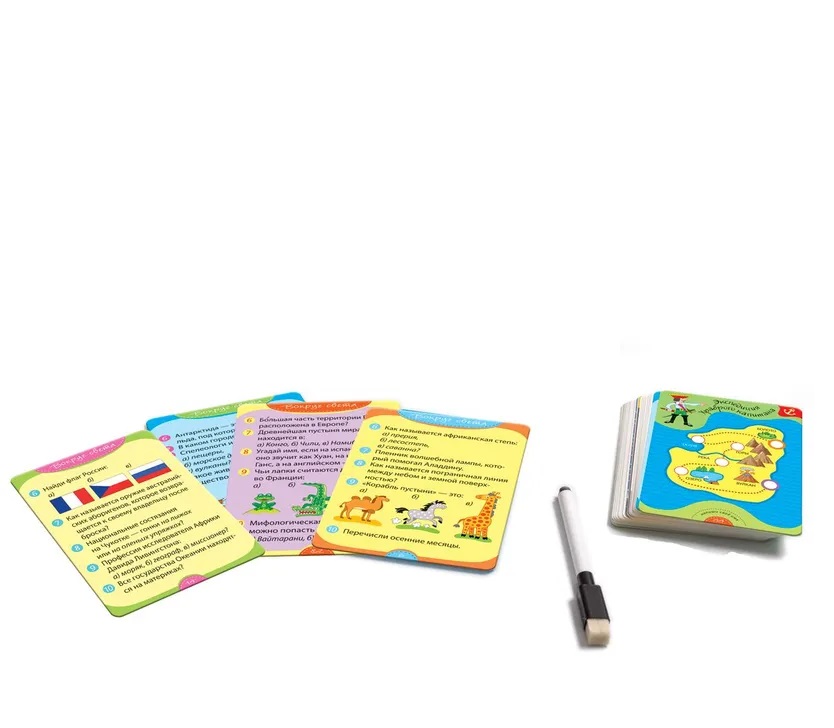 В комплекте: 50 двусторонних карточек, брошюра с правилами и ответами, маркер.