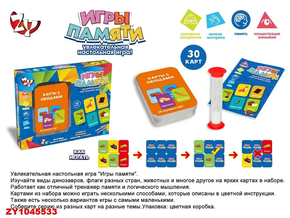 Комплектность: 30 игровых карт на тему "овощи", песочные часы, инструкция