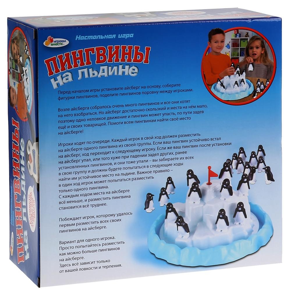 Настольная игра от компании «Играем вместе» предлагает всем деткам отправиться в незабываемое приключение в далекую Антарктику. Там у льдины их ждут пингвины, которых нужно спасти, найдя каждому на ней спасительное место. Все пингвины ходят скорее взобраться на айсберг, поэтому если один падает и толкает другого, то приходится начинать работу сначала.
