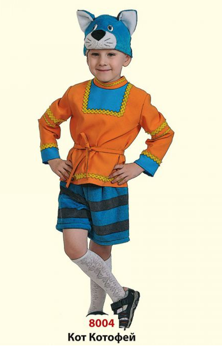 Карнав.костюм "Кот Котофей" 8004 Производитель: Карнавал OFF РОССИЯ Комплект: маска- шапочка котика, рубаха, пояс, шорты. Ткань: текстиль.