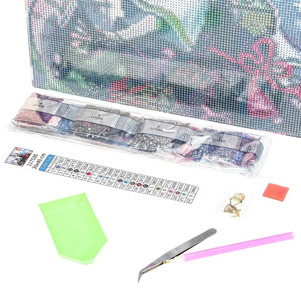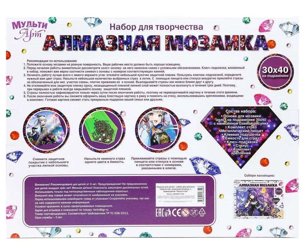 При помощи этого набора маленький художник сможет создать красивую картинку-мозаику, декорированную сверкающими стразами. Яркую блестящую поделку можно подарить близким или использовать для украшения комнаты.