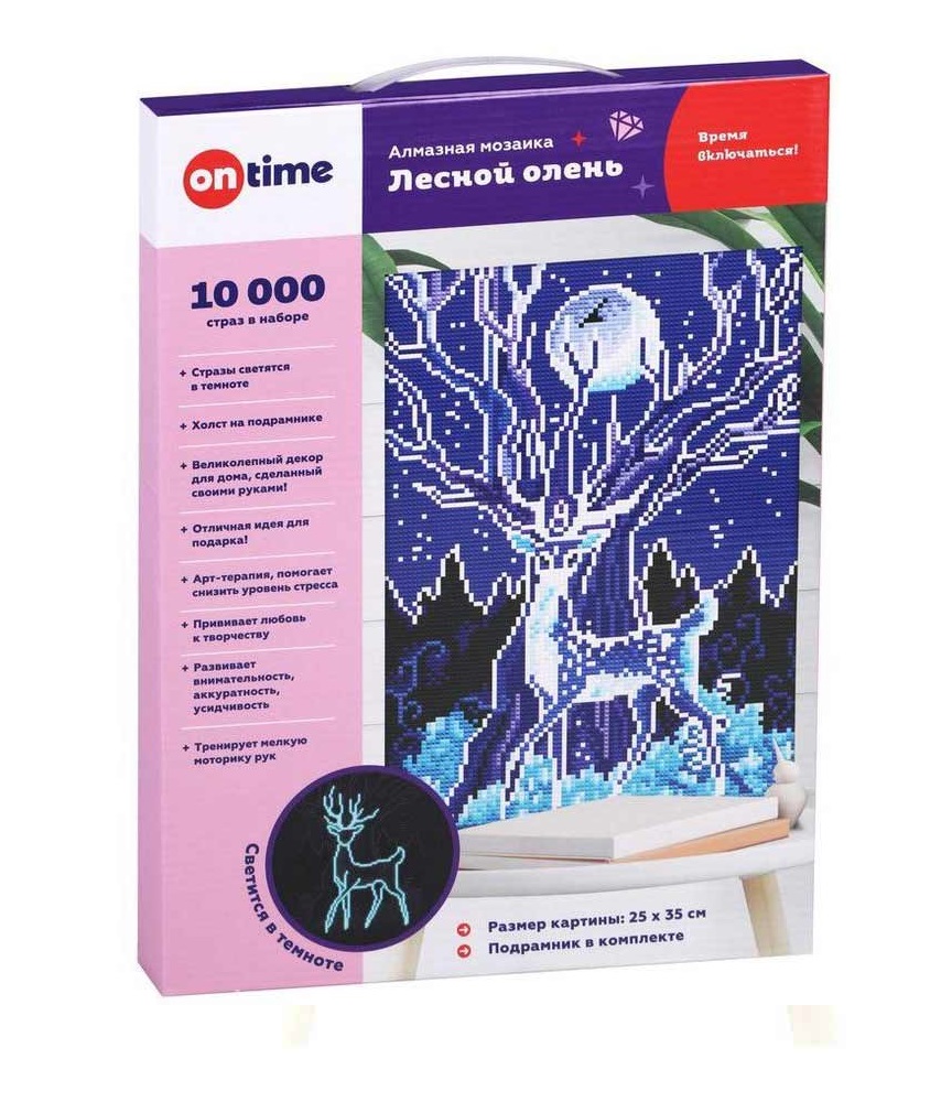 Алмазная мозаика Лесной олень 25х35 см On Time 45103. Душа требует творчества и арт-терапии? Тогда этот набор точно для вас! В комплекте есть все необходимое, чтобы создать необычный декор для дома – алмазную мозаику «Котенок». Задача не так проста, как может показаться. Здесь нужна внимательность, аккуратность и отточенность движений, но результат точно того стоит! Готовую картину будет видно даже ночью, потому что некоторые стразы светятся в темноте. Набор ТМ OnTime понравится не только детям, но и взрослым.