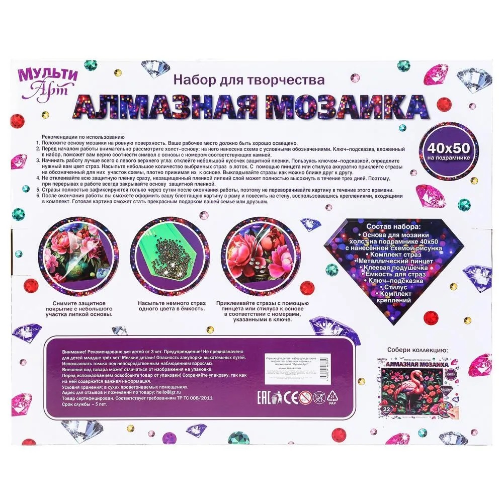 При помощи этого набора маленький художник сможет создать красивую картинку-мозаику, декорированную сверкающими стразами. Яркую блестящую поделку можно подарить близким или использовать для украшения комнаты.