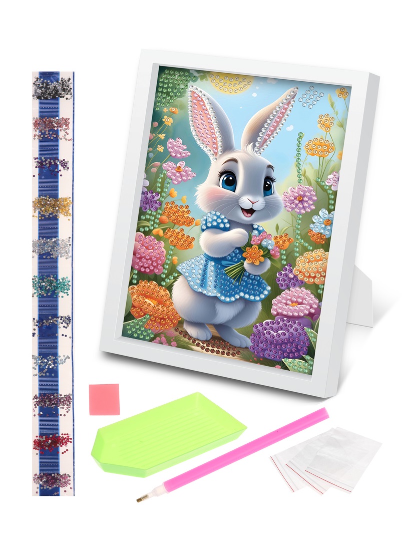 Алмазная мозаика «Зайка» включает 650 страз, картонную основу, рамку с подставкой, емкость для страз и инструмент для наклеивания страз.