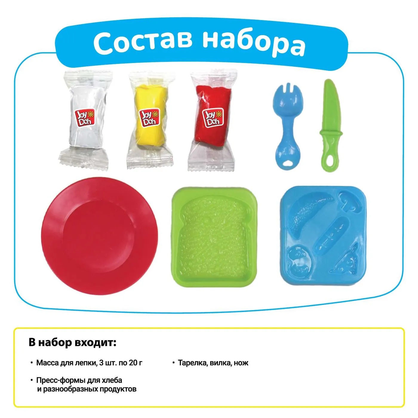 Комплектация: масса для лепки, 3 шт. по 20 гр.; поднос и тарелка с пресс-формами для разнообразных продуктов; ложка, вилка, нож