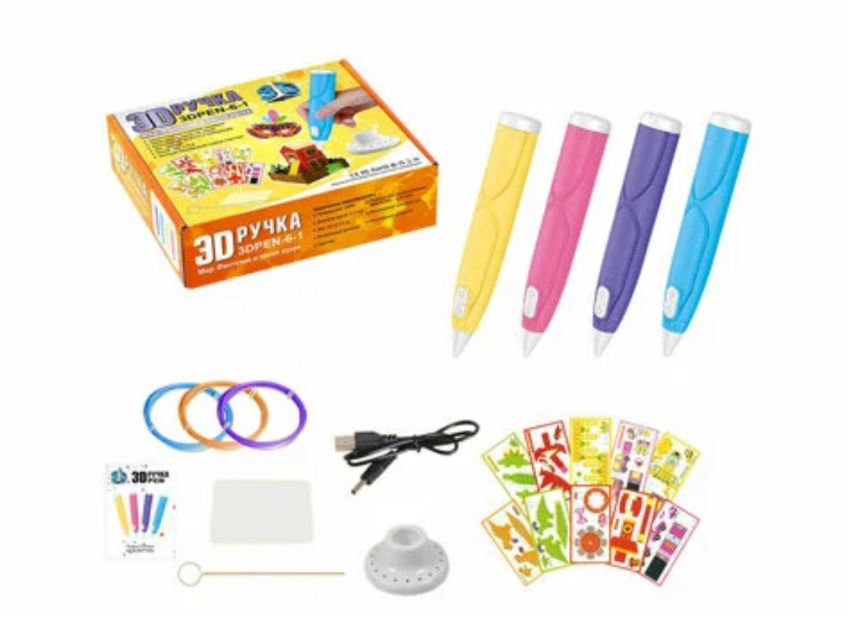 3D ручка с пластиком и трафаретами представляет собой настоящий DIY набор для создания трехмерных фигур. В набор входит: 3D ручка, 3 мотка PCL пластика (длина 2 м, диаметр 1,75 мм), USB-кабель, подставка для ручки, инструкция, 10 картонных трафаретов, прозрачный коврик для рисования, спица для чистки сопла. Ручка не имеет встроенного аккумулятора и работает только при подключении к источнику питания. Размер ручки 18*3 см. Индивидуальная упаковка картонная коробка размером 23*19*6 см.