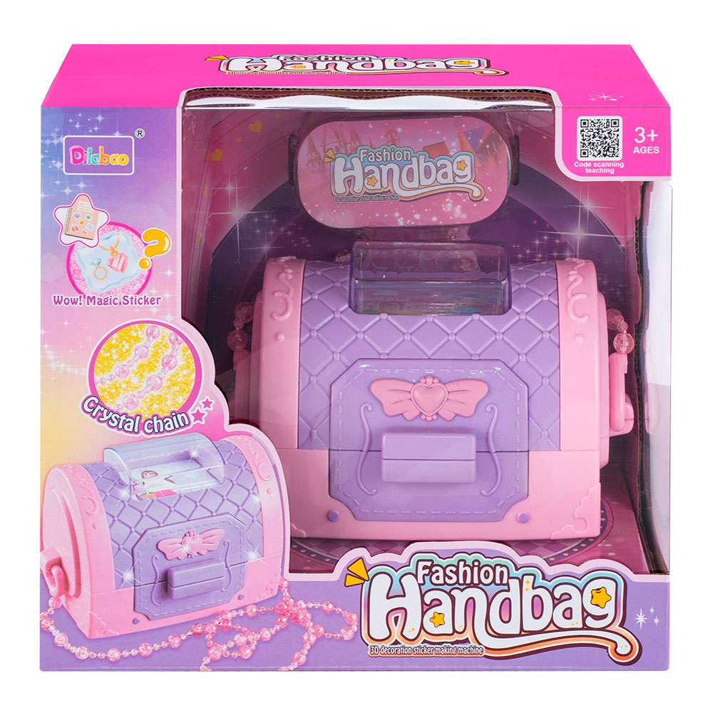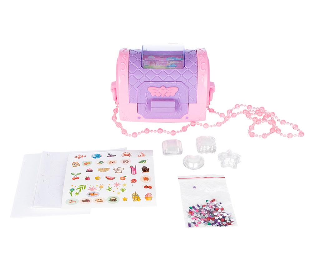 Игровой набор «Шкатулка принцессы» Maya Toys 6601. С помощью набора можно создать 24 объемных прозрачных стикера 4 форм со стразами внутри. Для этого необходимо выдвинуть верхний ящик из машинки для создания стикеров, поместить туда бумажную форму для стикера, в эту форму поместить соответствующую прозрачную заготовку для стикера, внутрь прозрачной заготовки засыпать стразы, накрыть картонным основанием для стикера рисунком вниз, задвинуть ящик внутрь машинки и нажать на кнопку сверху. Готовый стикер окажется в нижнем ящике машинки. На оборотную сторону стикера необходимо наклеить липкий слой.