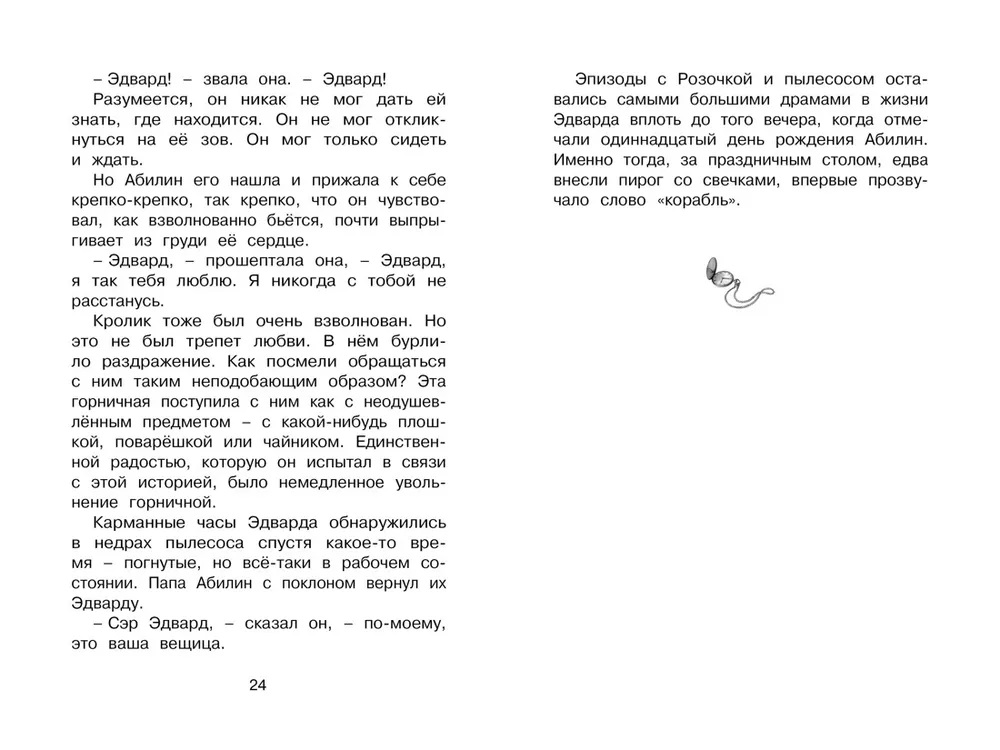 «Однажды жил на свете фарфоровый кролик, которого любила маленькая девочка. Этот кролик отправился в путешествие по океану и упал за борт, но его спас рыбак. Он был погребён в куче мусора, но его отрыла собака. Он долго странствовал с бродягами, но совсем недолго простоял чучелом в огороде… Этот кролик танцевал на улицах Мемфиса. Повар разбил ему голову, а кукольных дел мастер её склеил…» Эта печальная, но светлая история кролика Эдварда не оставит равнодушным ни взрослых, ни детей. Любовь, доброта, сострадание – вот главные темы повести, которая обязательно тронет сердце читателей.