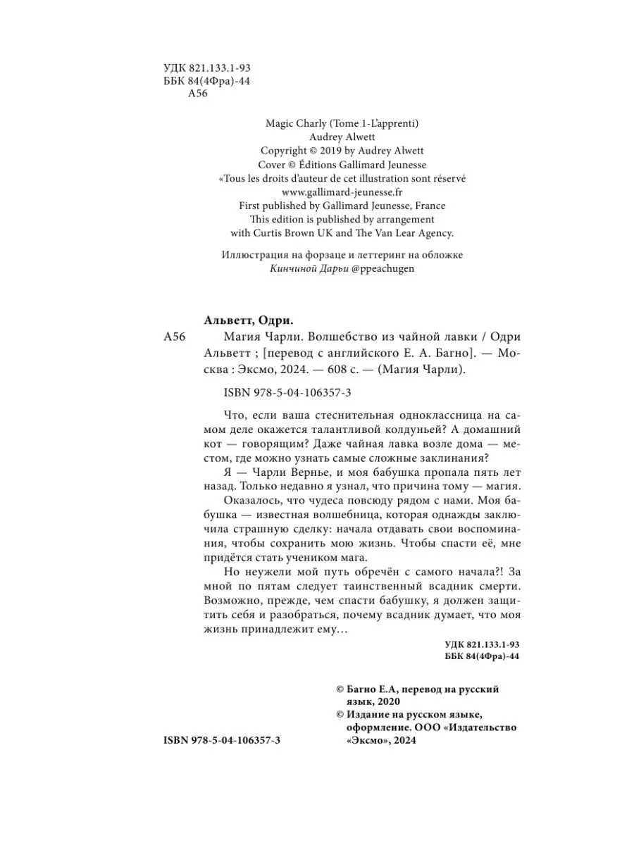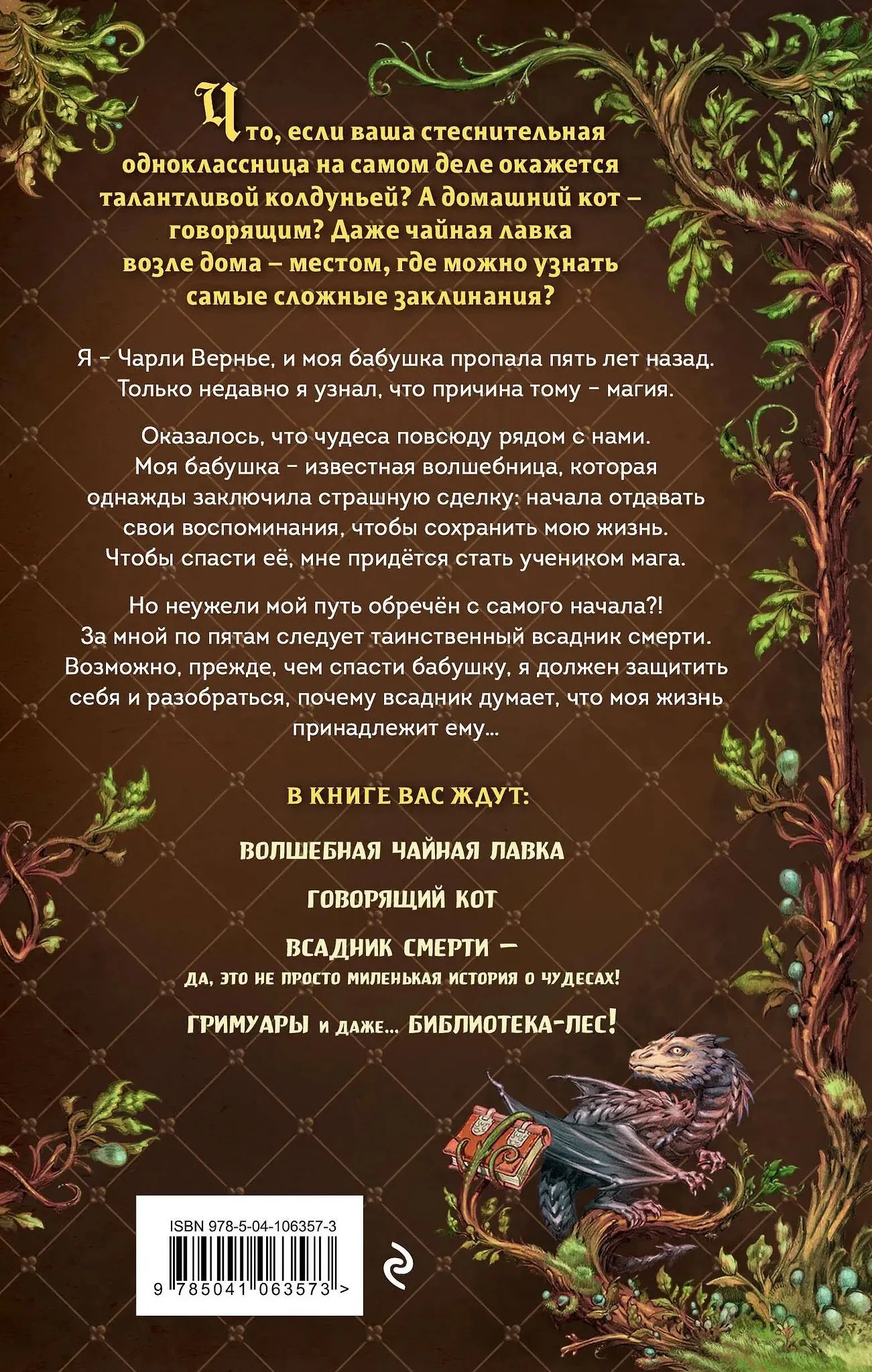 Новинка! Фэнтези-трилогия магия и волнующие каждого подростка вопросы. Что, если ваша стеснительная одноклассница на самом деле окажется талантливой колдуньей? А домашний кот — говорящим? Даже чайная лавка возле дома — местом, где можно узнать самые сложные заклинания? Я — Чарли Вернье, и моя бабушка пропала пять лет назад. Только недавно я узнал, что причина тому — магия. Оказалось, что чудеса повсюду рядом с нами. Моя бабушка — известная волшебница, которая однажды заключила страшную сделку — начала отдавать свои воспоминания, чтобы сохранить мою жизнь. Чтобы спасти её, мне придётся стать учеником мага. Но неужели мой путь обречён с самого начала?! За мной по пятам следует таинственный всадник смерти. Возможно, прежде чем спасти бабушку, я должен защитить себя и разобраться, почему всадник думает, что моя жизнь принадлежит ему… Для фанатов ярких характеров и трогательного юмора в духе Пратчетта и мана. Ближайший аналог в нише — «Девочка, которая не видела снов». Книга входит в ТОП-100 фэнтези для подростков на е. Завораживающая, детально проработанная обложка от потрясающего французского иллюстратора Стэна Манюкяна, мастера рисования фэнтезийных существ. Яркие иллюстративные форзацы и леттеринг от популярной художницы Пичи. Волшебные чёрно-белые виньетки в блоке передают магическую атмосферу книги. Идеально для читателей 10—15 лет!