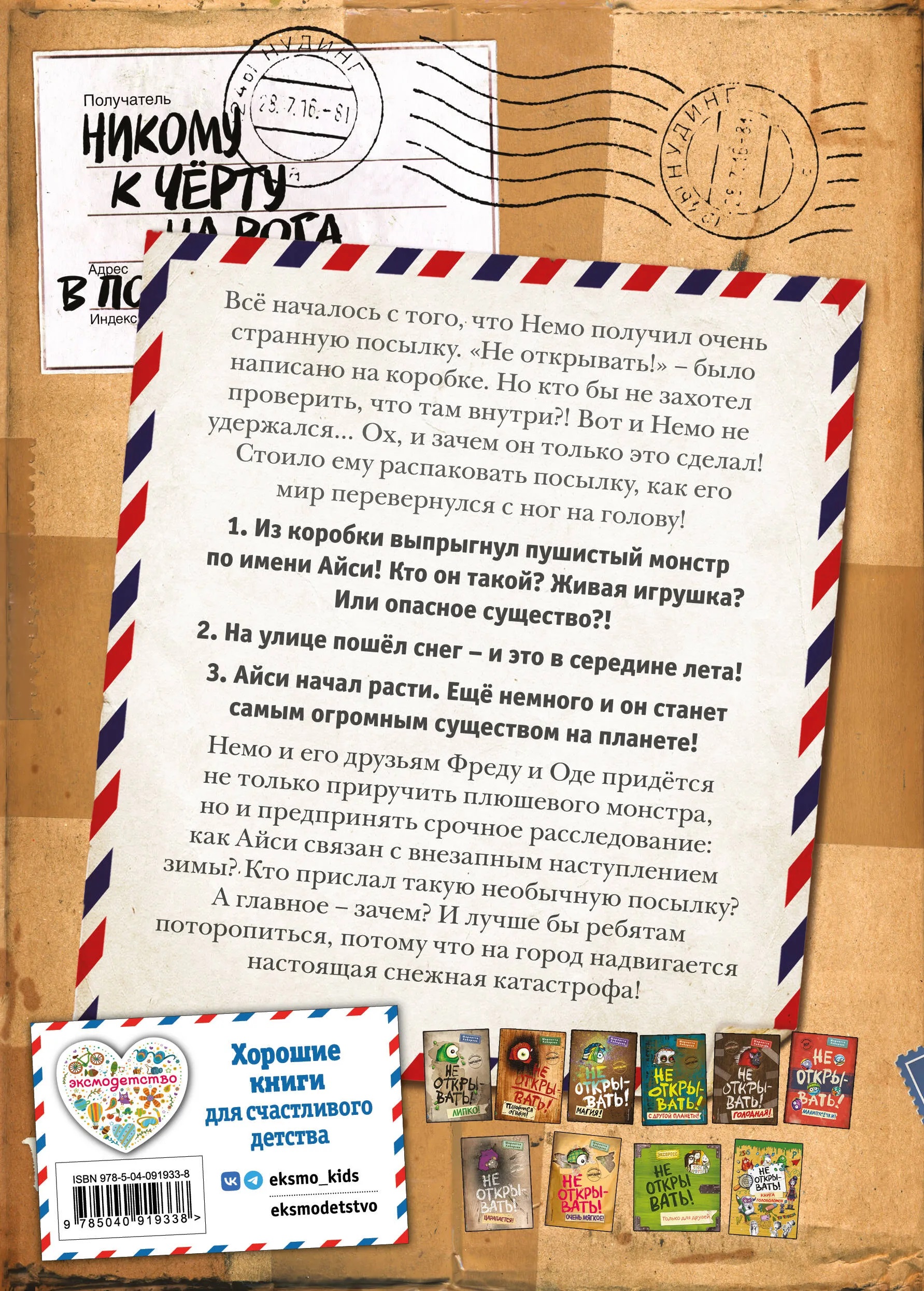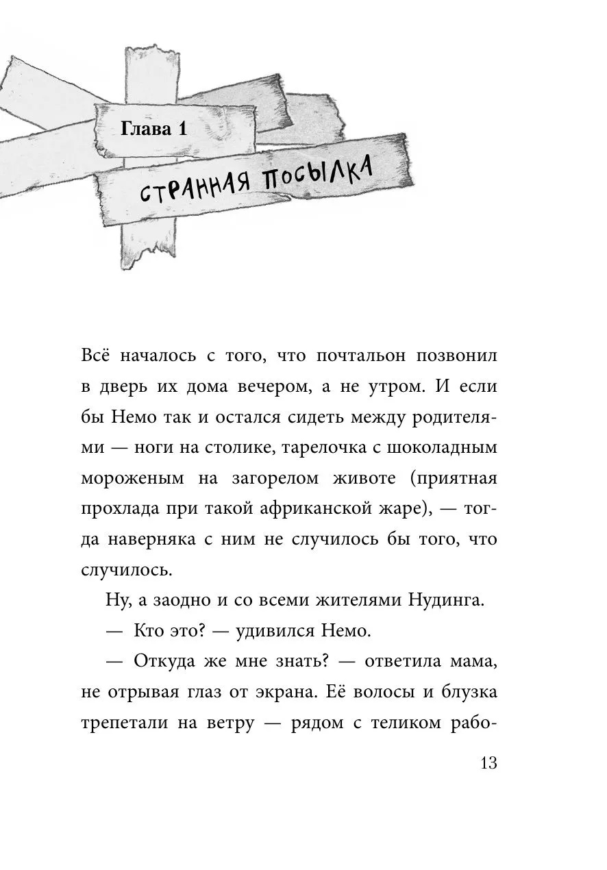 Угораздило же Немо родиться в Нудинге, самом скучном городке на свете! А ведь он всю жизнь мечтал о приключениях — но разве в таком болоте случится что-нибудь интересное?! Однако мальчик и подумать не мог, какие головокружительные перемены его ждут… Всё началось с того, что к нему в руки попала странная посылка с надписью «Не открывать!». Конечно же, Немо ни минуту не сомневался — эту коробку надо срочно открыть! И как же он удивился, когда обнаружил внутри плюшевого йети — живого и очень прожорливого! А тем временем на улице пошёл снег — прямо в середине лета! Теперь Немо и его друзьям Фреду и Оде нужно выяснить: кто же такой этот йети? Как его приручить? А главное — кто и зачем его прислал? Ребятам придётся поторопиться: ещё немного — и в городе случится снежная катастрофа!