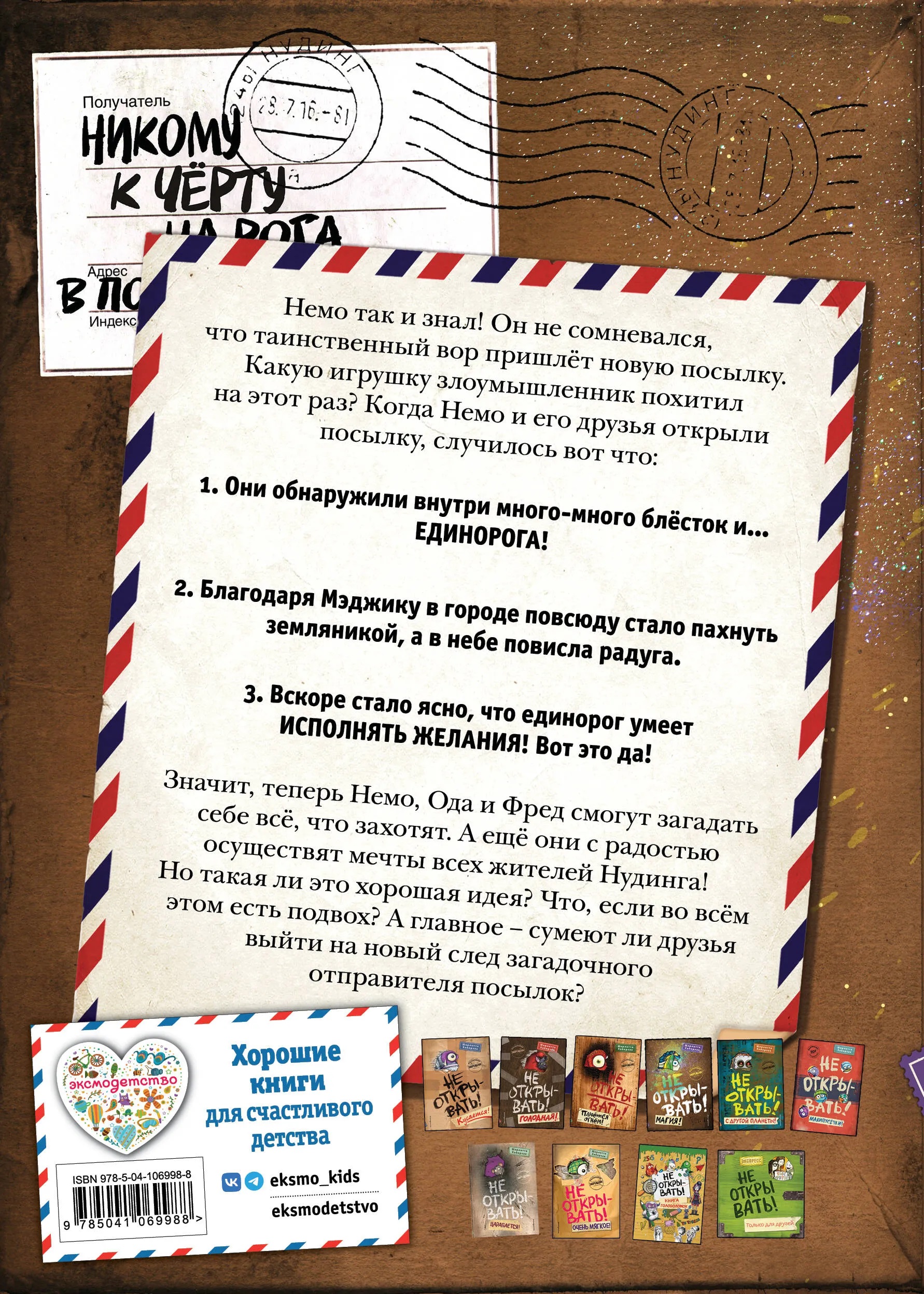 Новая посылка уже здесь! Немо, Ода и Фред так и знали, что таинственный вор объявится снова! На этот раз он прислал посылку, усыпанную блёстками. Когда друзья открыли её, они обнаружили внутри живого ЕДИНОРОГА! У Мэджика разноцветная чёлка, из-за него в городе повсюду стало пахнуть земляникой, а ещё он легко исполняет желания! Ребята не могут поверить своему счастью: неужели им наконец повезло и ожившая игрушка не доставит им никаких неприятностей?! Теперь они смогут пожелать себе что угодно! Но что, если во всём этом есть подвох? Может быть, Мэджик не так прост, как кажется? И получится ли у Немо и его друзей выйти на новый след отправителя посылок?