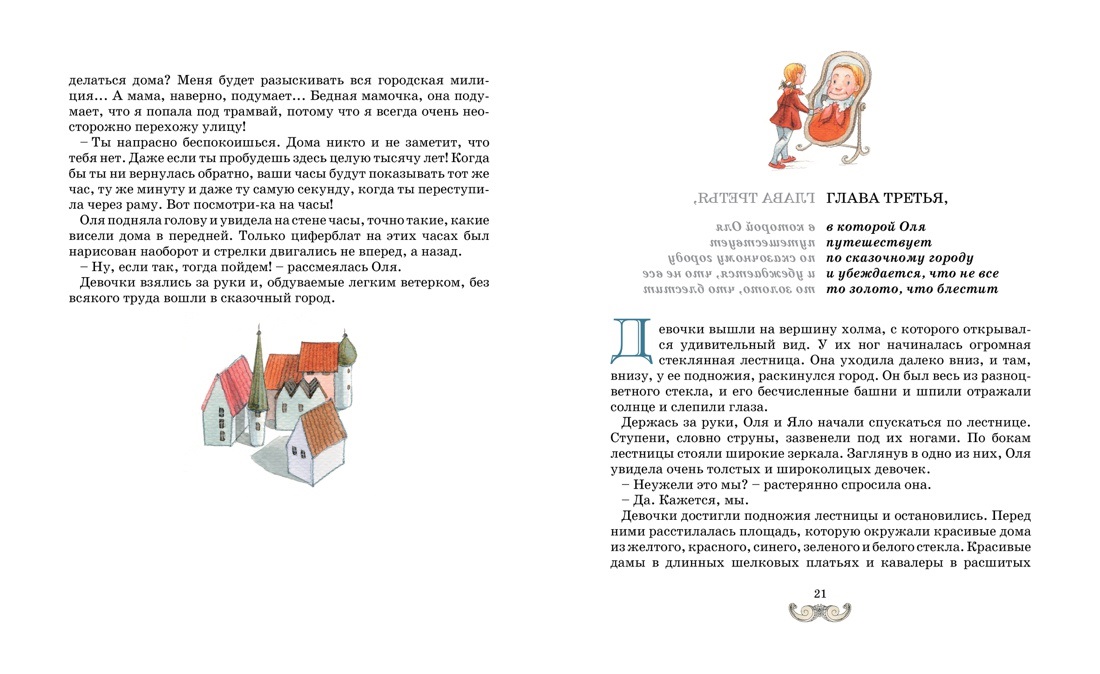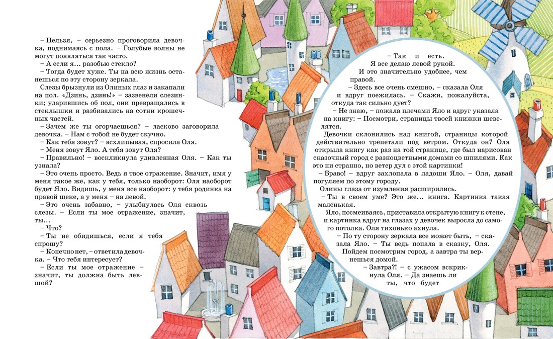 Однажды девочка Оля, шагнув через зеркало, попала в КОРОЛЕВСТВО КРИВЫХ ЗЕРКАЛ, где ей пришлось пережить немало опасных приключений. Ей удалось увидеть себя со стороны, познакомившись с точно такой же, как она, девочкой по имени Яло. Наблюдая за этой девочкой, как за самой собой, Оля смогла избавиться от недостатков, которых раньше в себе не замечала.