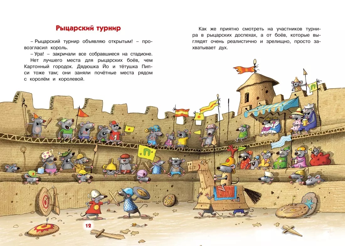 В Картонном городке жизнь бьёт ключом! Его обитатели весело проводят время, особенно дружное семейство Папмайеров. Вот уж кто всегда найдёт, чем себя занять, и не пропустит ни одного важного события, будь то авиационный парад, съёмки кинофильма или рыцарский турнир. Мышата Йоги и Берт Папмайеры даже приняли в нём участие. И совсем не важно, что кое-кто на этом турнире вместо рыцарского меча держал... обыкновенную швабру. Главное – кровожадный дракон был побеждён!
