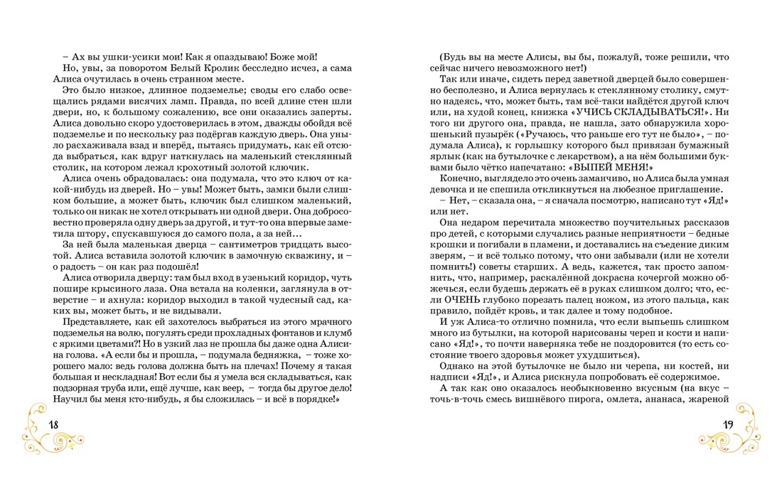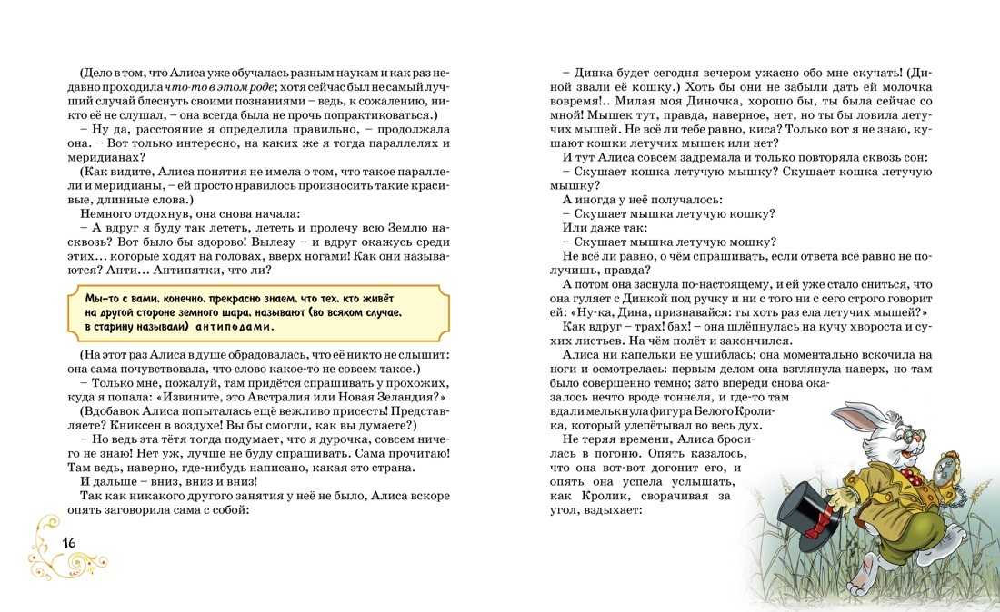 Борис Заходер, замечательный детский писатель, блестяще перевёл «АЛИСУ В СТРАНЕ ЧУДЕС» на русский язык и написал в предисловии, «что, хотя эта сказка для детей, пожалуй, больше детей любят её взрослые…». Вот такая необычная сказка. Если вы почему-то ещё не успели её прочитать, скорее открывайте книгу, чтобы вместе с Алисой отправиться за удивительными приключениями.