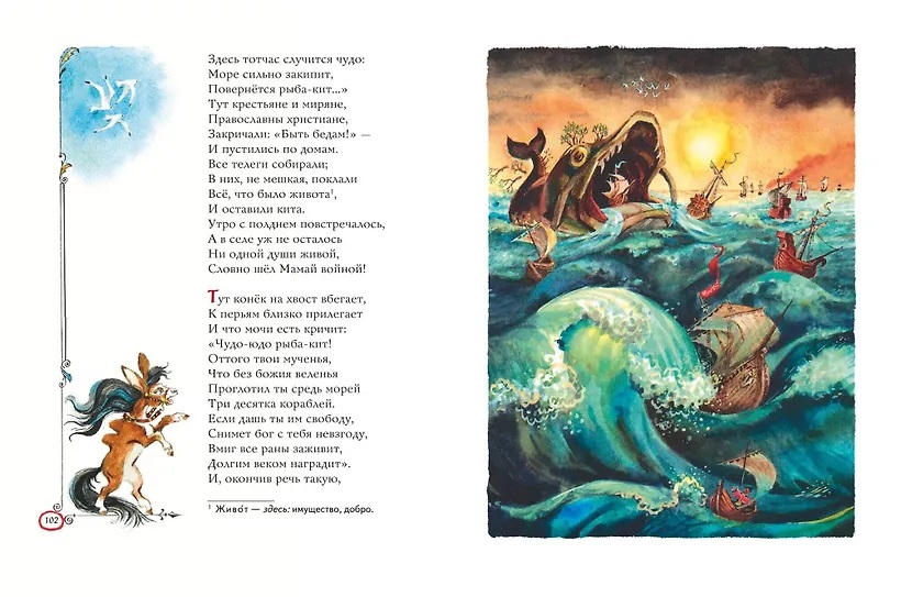 Издание в твёрдом переплёте с частичным лаком. Плотная белая бумага. Чёткий, удобный для чтения шрифт. Полноцветные иллюстрации. Замечательная поэтическая сказка Петра Павловича Ершова «Конёк-горбунок» приглашает читателей совершить увлекательное путешествие по волшебным царствам и мирам и пережить множество необыкновенных приключений. Звонкие, легко запоминающиеся строчки расскажут о традиционном герое русского фольклора — простодушном Иванушке и о его верном друге, чудесном коньке-горбунке. А тонкие, изящные и точные иллюстрации известного мастера, народного художника России Анатолия Елисеева помогут познакомиться поближе с диковинными существами и подробно рассмотреть все детали необыкновенных странствий.