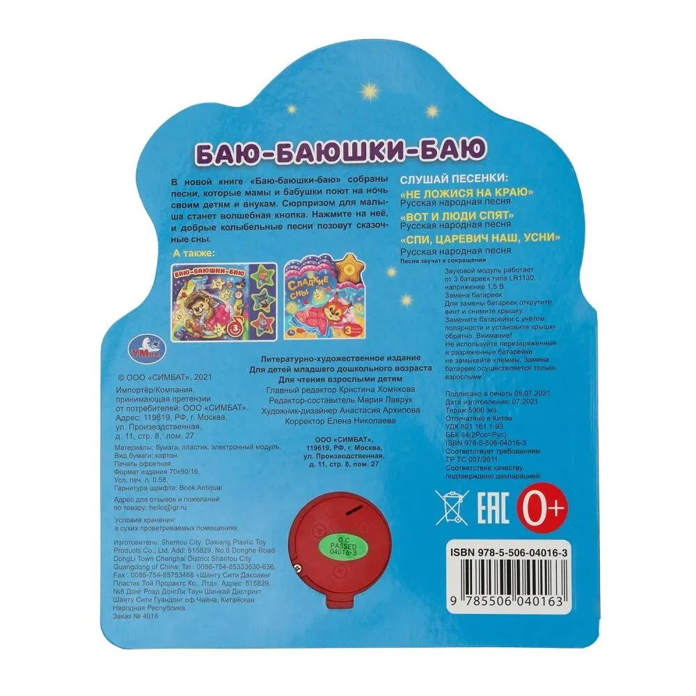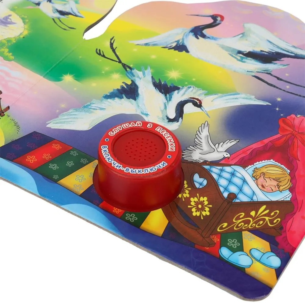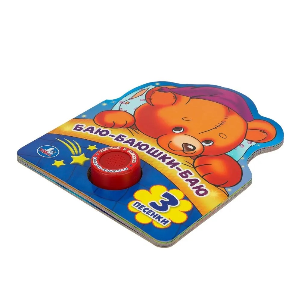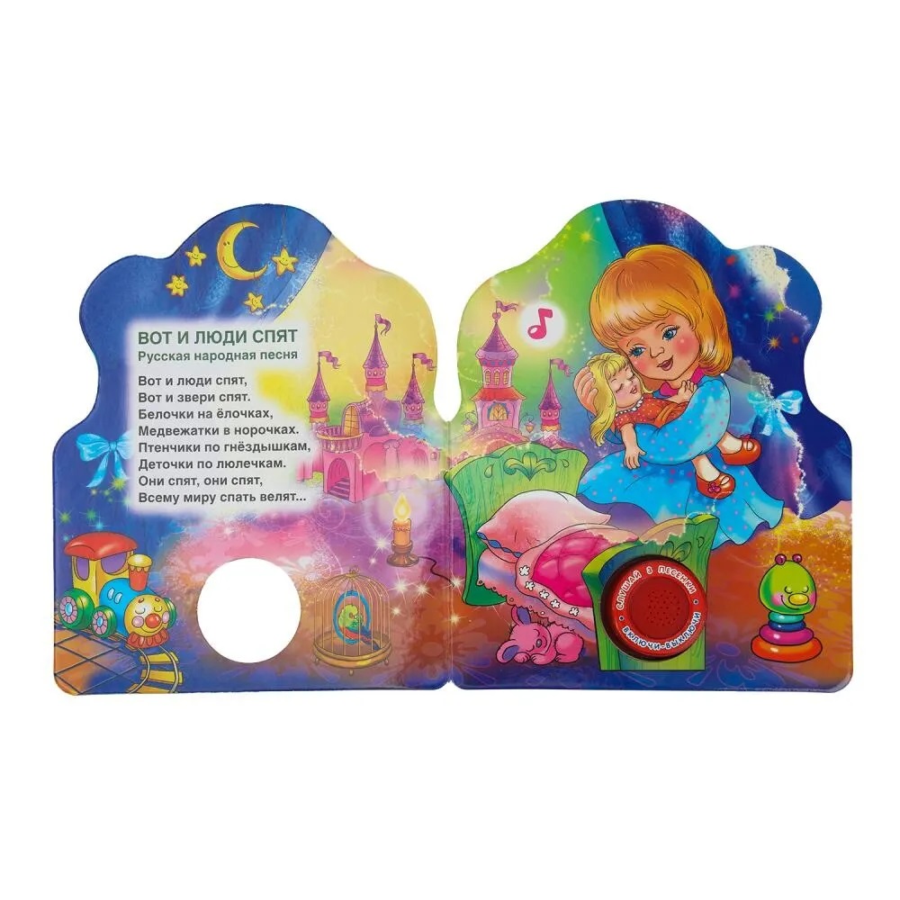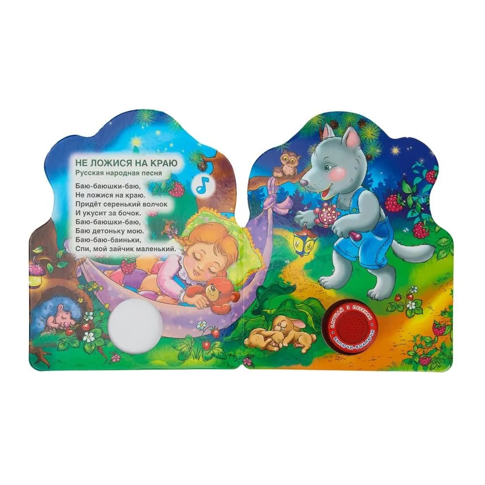 Ребенок с удовольствием будет листать плотные страницы с яркими картинками, нажимать на кнопку и слушать мелодичные колыбельные песенки. Одно нажатие на кнопку – песенка включится, второе нажатие – выключится и т.д. Книжка сделана из плотного картона, поэтому родители могут не опасаться за ее сохранность. Благодаря компактному формату книгу удобно брать с собой в дорогу.