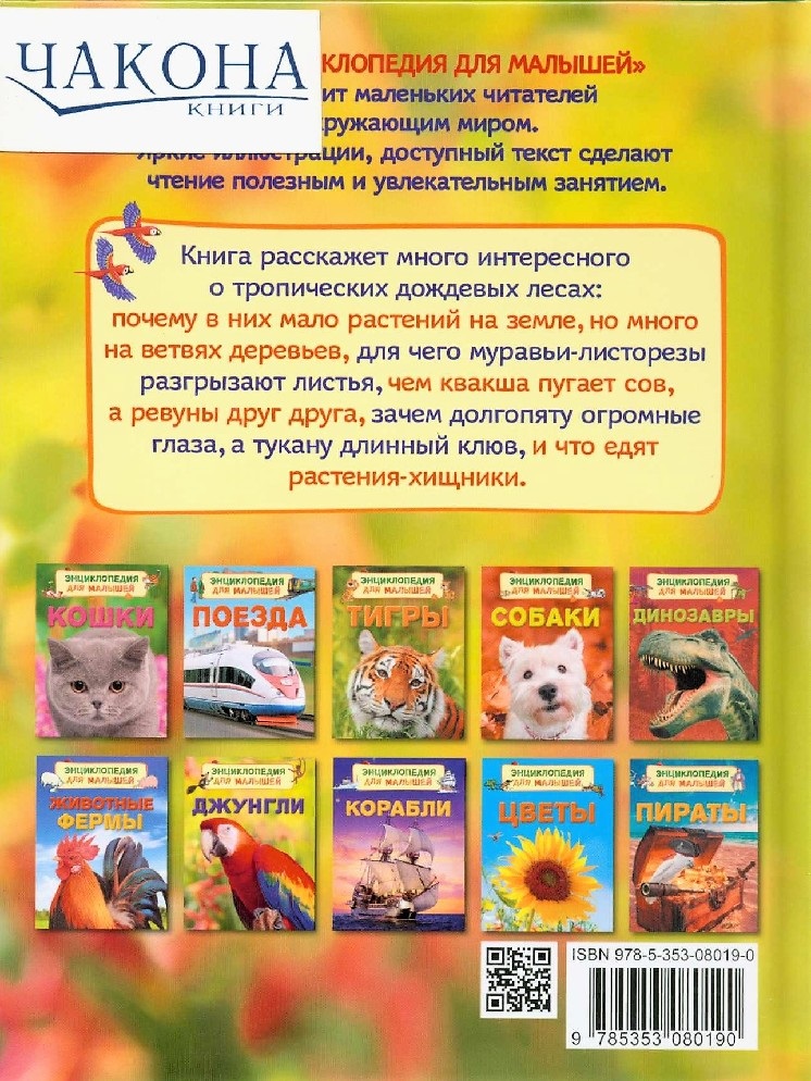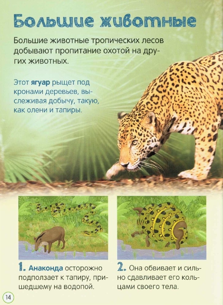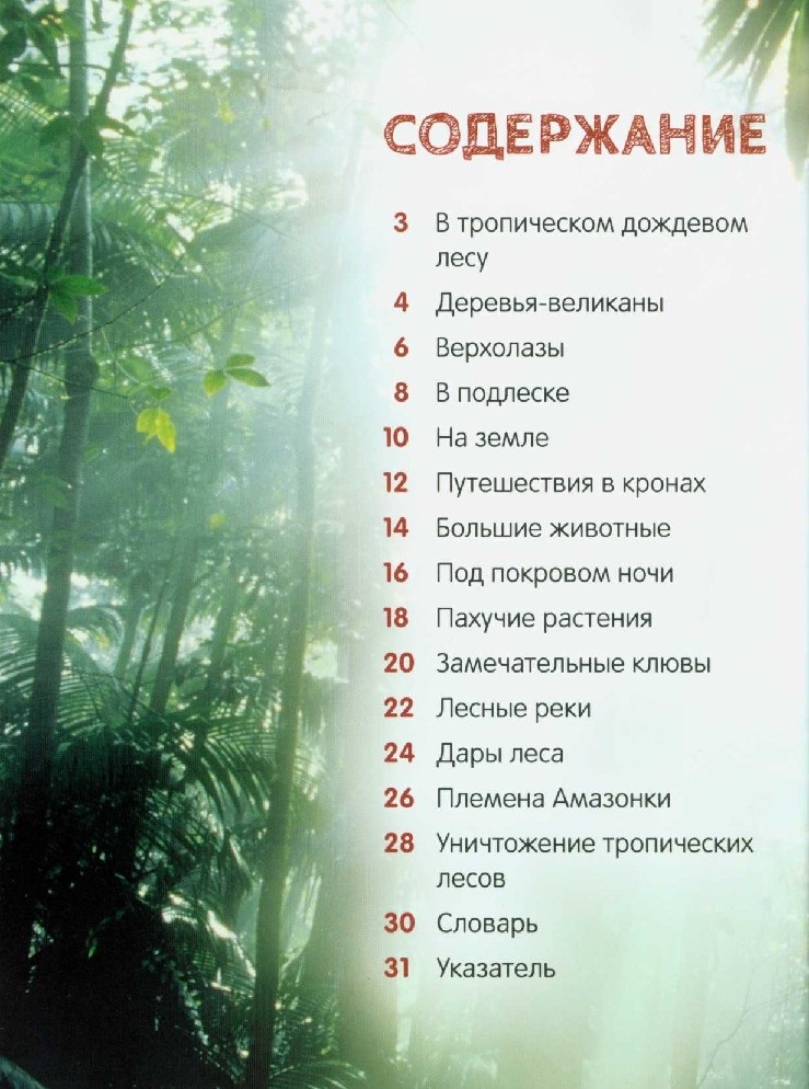 В книге рассказывается о тропических дождевых лесах. Маленькие читатели узнают, почему растения располагаются ярусами, какие животные заселяют каждый из ярусов, кто из хихников охотится по ночам, а кто нападает на добычу средь бела дня, какие дары джунгли припасают для людей и в чем причина исчезновения лесов.
