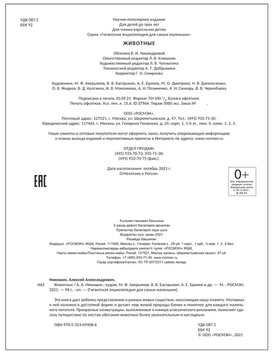 Новая серия "Гигантская энциклопедия для самых маленьких" - это самые первые энциклопедии для малышей, созданные российскими авторами. Одна из самых любимых малышами тем - "Животные" - рассказана просто и ярко проиллюстрирована. Малыш узнает, как на Земле появилась жизнь, познакомится со всеми видами животных, узнает интересные факты о птицах, рыбах, млекопитающих, домашних питомцах. В каждой книге серии: лаконичное и современное оформление, небольшое количество текста, подобранное с учетом возрастных особенностей детей от 3 лет, реалистичные и приятные иллюстрации, выполненные в манере классического рисования, последовательная структура и инструкция по работе с книгой.