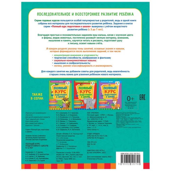 Задания в книгах серии «Полный курс подготовки к школе» выверены с учетом возрастного развития ребёнка (с 3 до 7 лет). Благодаря простым и познавательным заданиям ваш малыш, начав с изучения цвета и формы, видов животных, постепенно разовьет мелкую моторику, внимание, мышление и память, научится читать и рисовать, подготовит руку к письму, освоит навыки счета. Книги разработаны на основе общих подходов и соответствуют требованиям современных образовательных программ дошкольного образования.