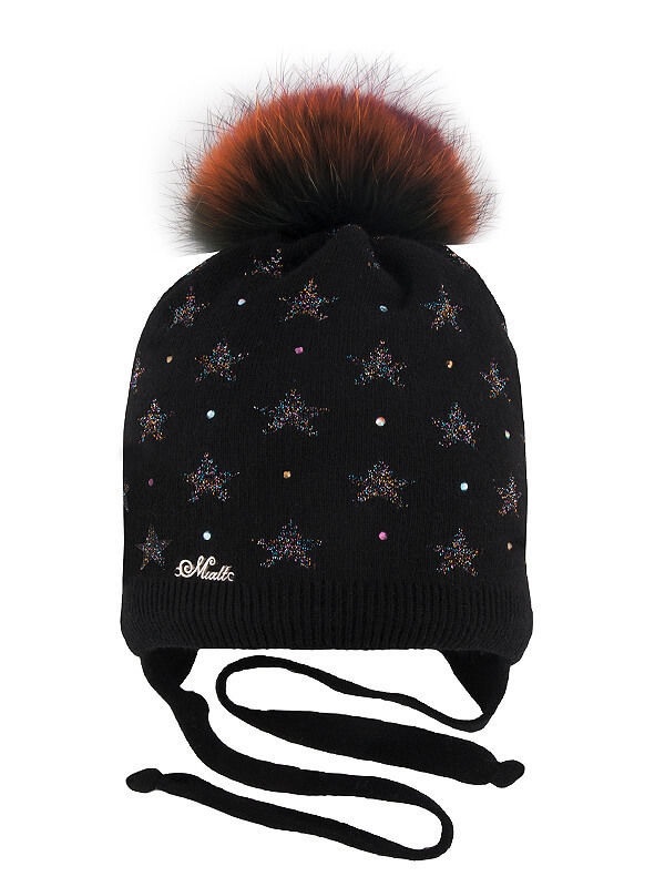 Зимняя шапочка удлиненной формы с завязками и с закрепкой по заднему шву. Гипоаллергенный утеплитель и гигроскопичная хлопковая подкладка гарантируют сохранность температурного баланса. По низу изделия резинка. Съемный многоцветный помпон окраски " мультиколор" крепится кнопкой. Звездочки, вывязанные нитью метанита, и стразы повторяют оттенки яркого помпона.