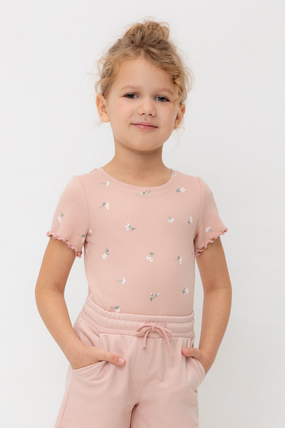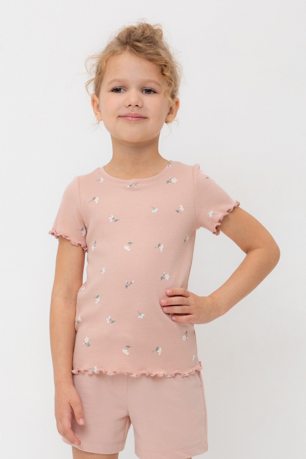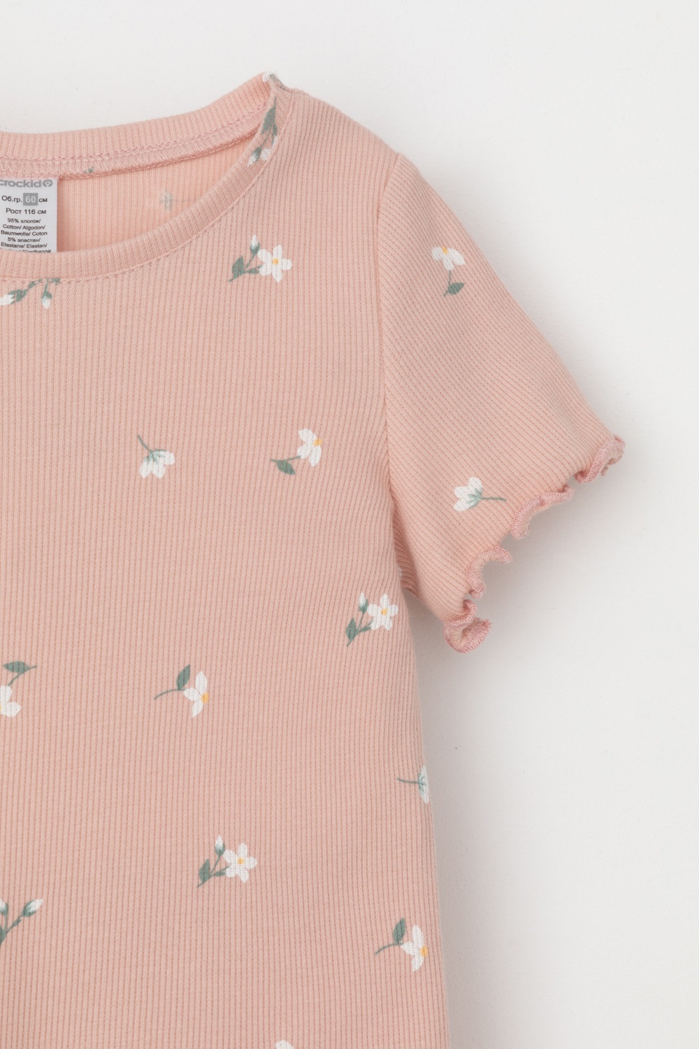 Футболка для девочки из эластичного трикотажа в рубчик. Оригинальная набивка выполнена из стойких текстильных гипоаллергенных красителей. Изделие сохраняет цвет и форму после многократных стирок.