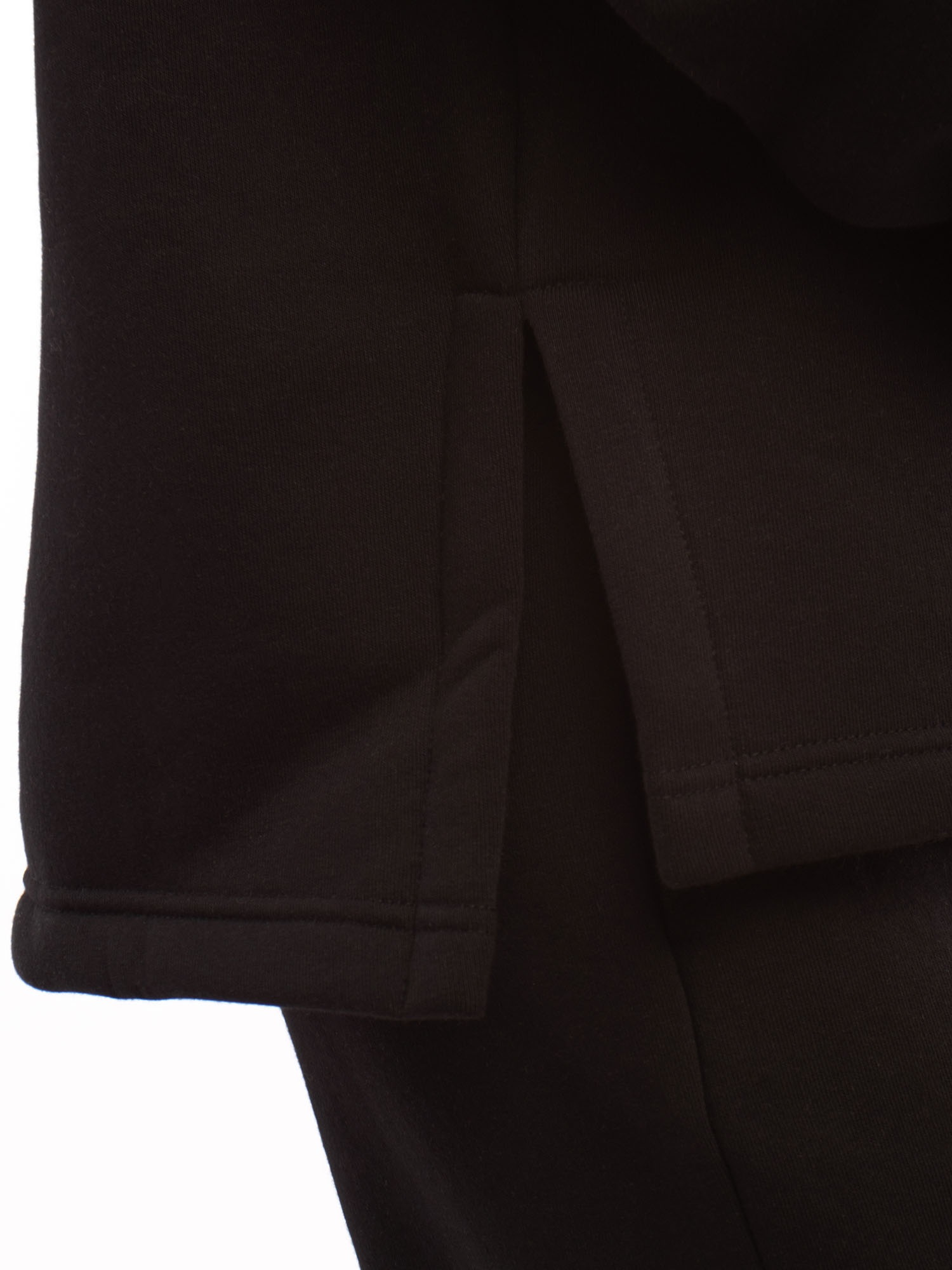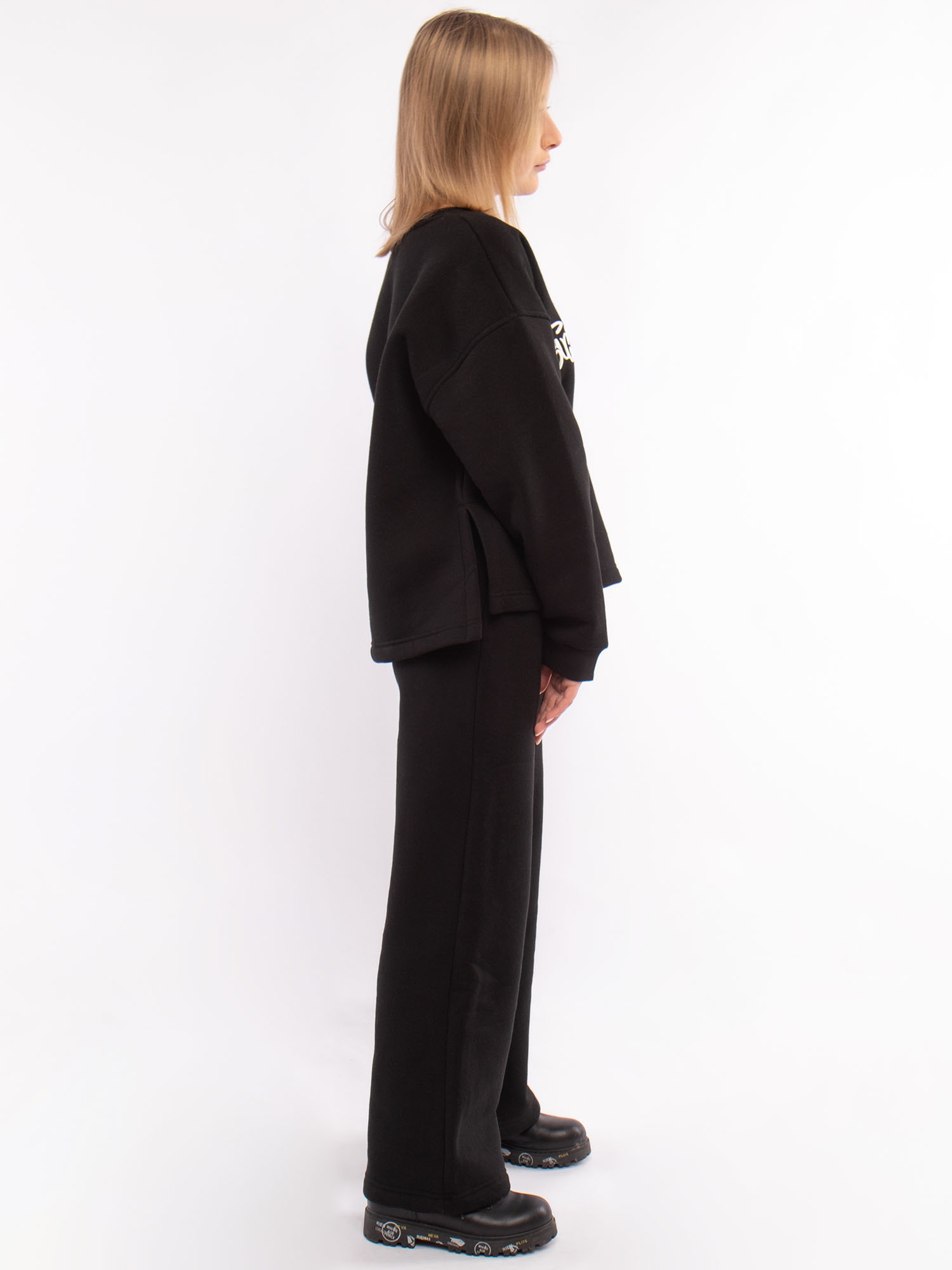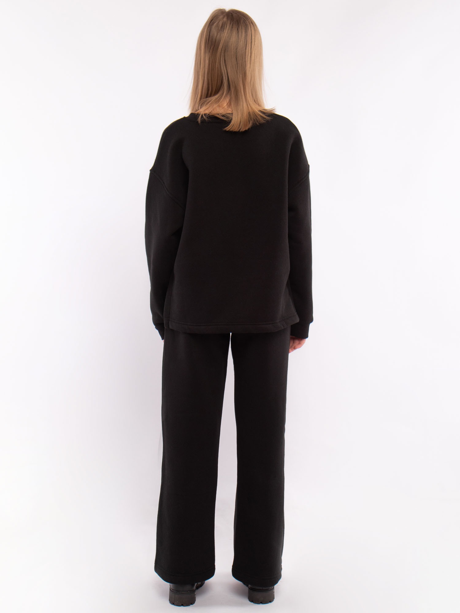 Костюм для детей и подростков из футера с начесом черный: свитшот (джемпер) и брюки для девочки. Свитшот оверсайз с нашивкой на груди. Брюки широкие однотонные.