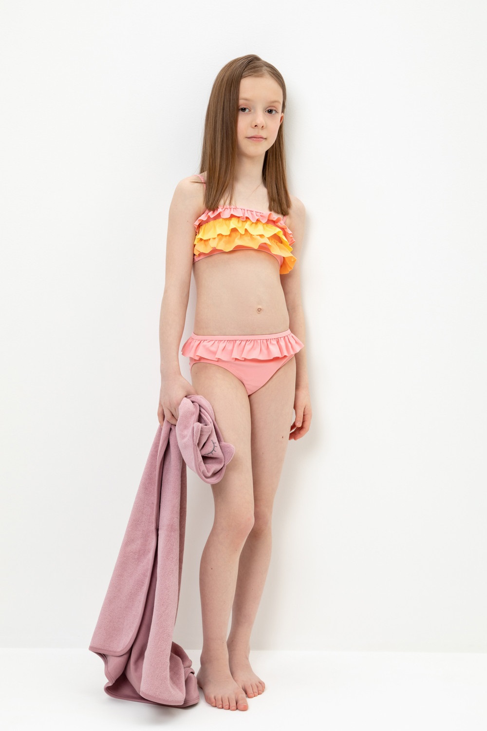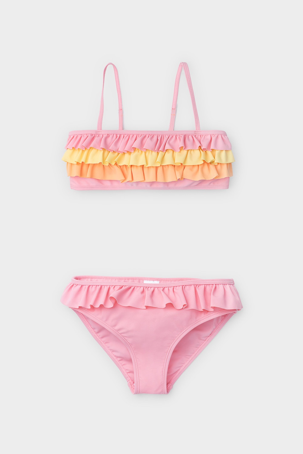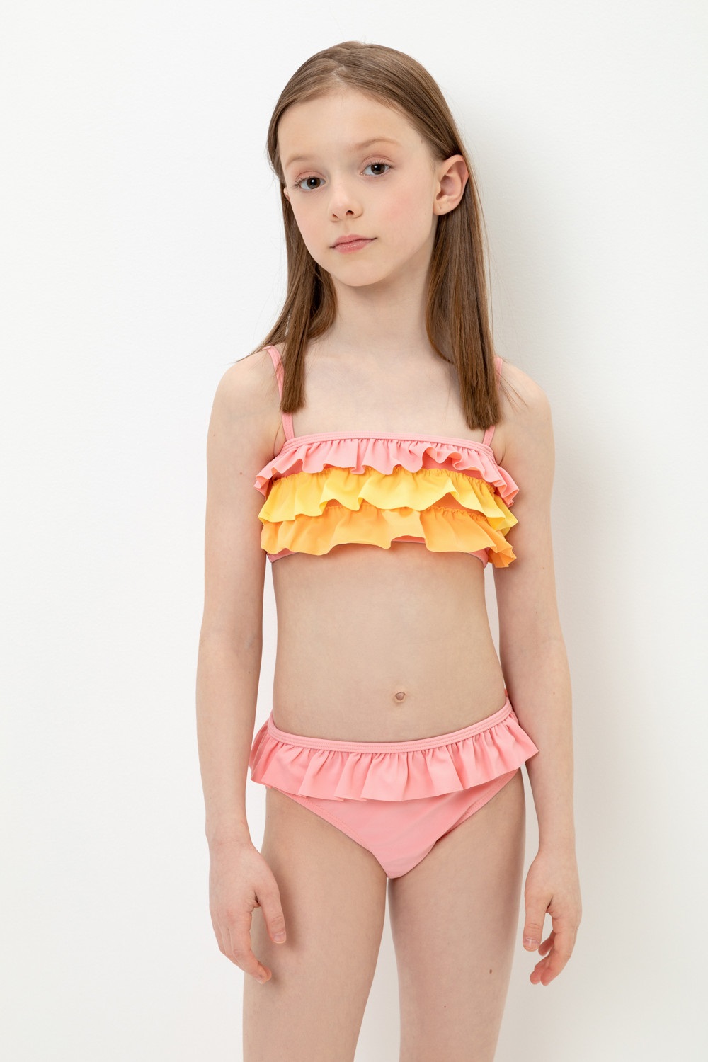 Раздельный купальник для девочки. Топ на эластичных бретелях и плавки на резинке. Украшен воздушными оборками.