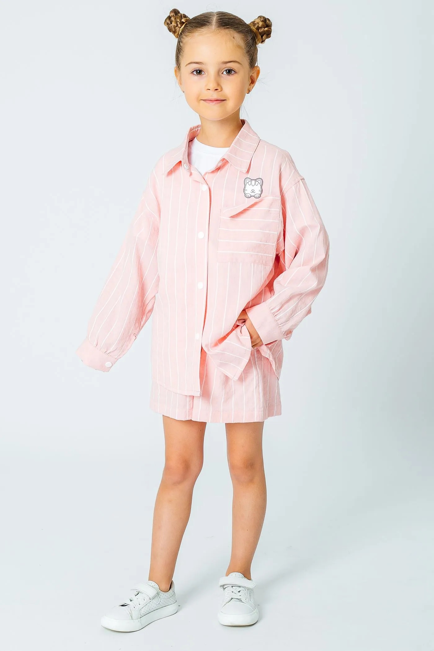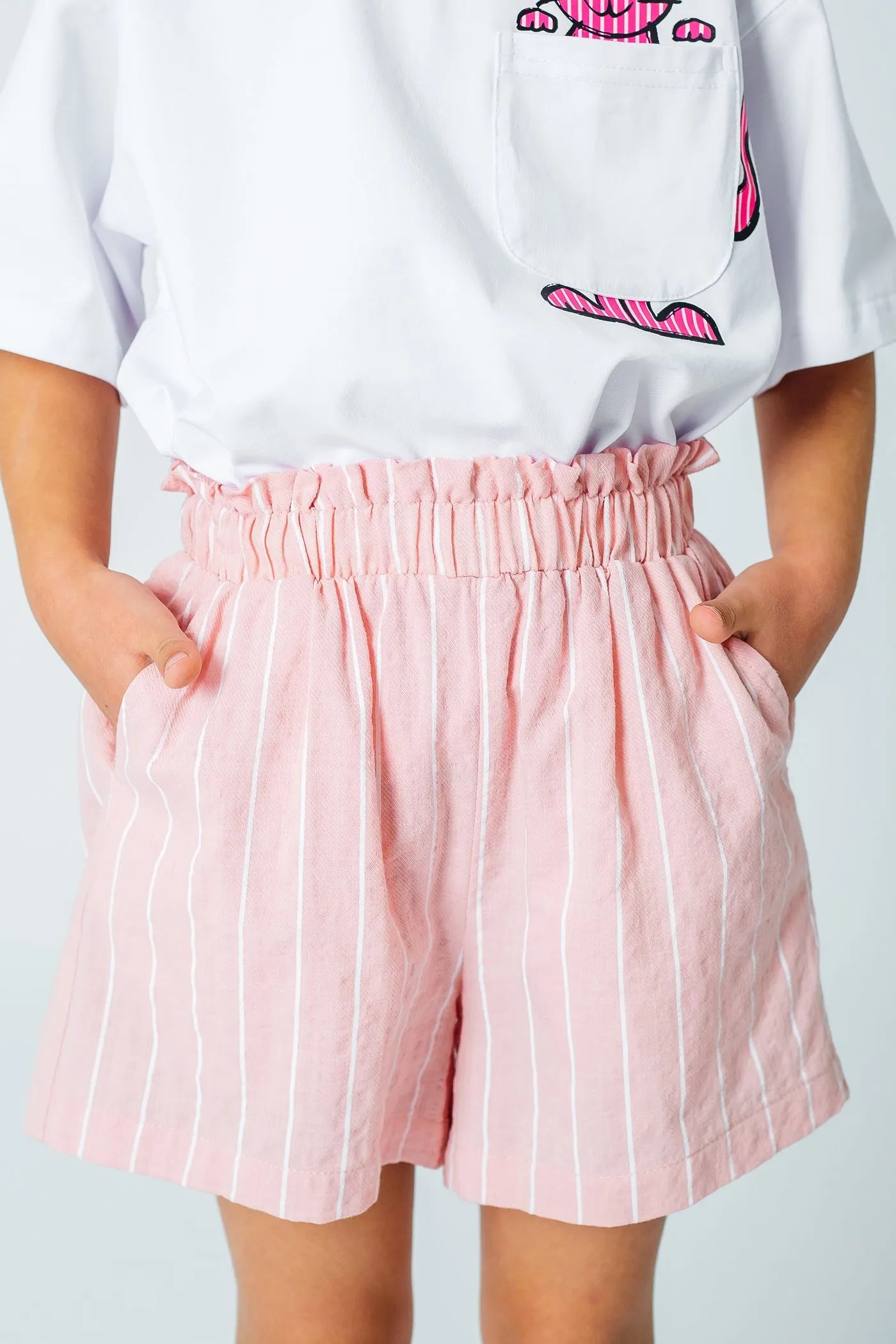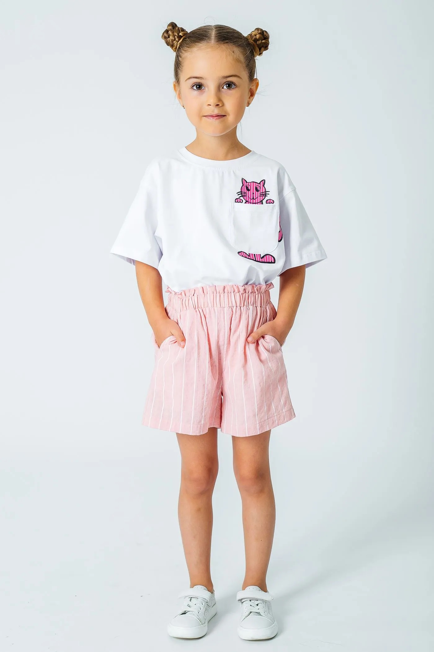Летние шорты для девочки сшит из чистого хлопка. Ткань легкая и приятная к телу, дышащая, так что купить эти шорты можно для самых жарких дней. Модель свободного покроя, посадка высокая, пояс на широкой и мягкой резинке, по верхнему краю узкая оборка. Штанины средней длины и ширины, прямые. По бокам втачные карманы, также есть один накладной карман сзади. Носить эти шорты можно с укороченными топами короткими блузами, рубашками, футболками.