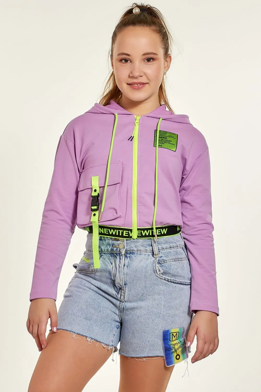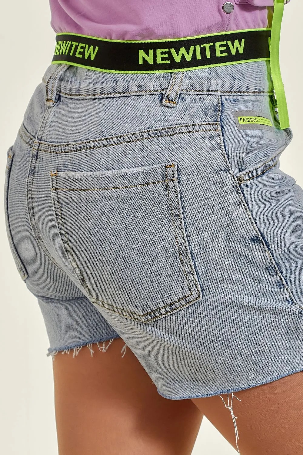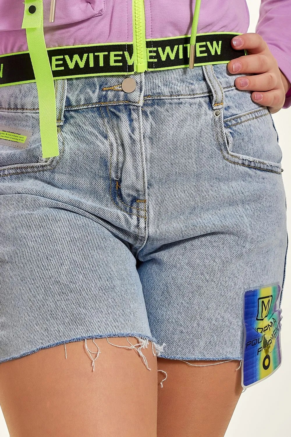 Джинсовые шорты для девочек. Изделие выполнено из высококачественного хлопкового денима. Модель пяти карманного кроя. Перед и пояс изделия украшен декоративными вставками с контрастными принтами в виде надписи. Низ изделия не оформлен.