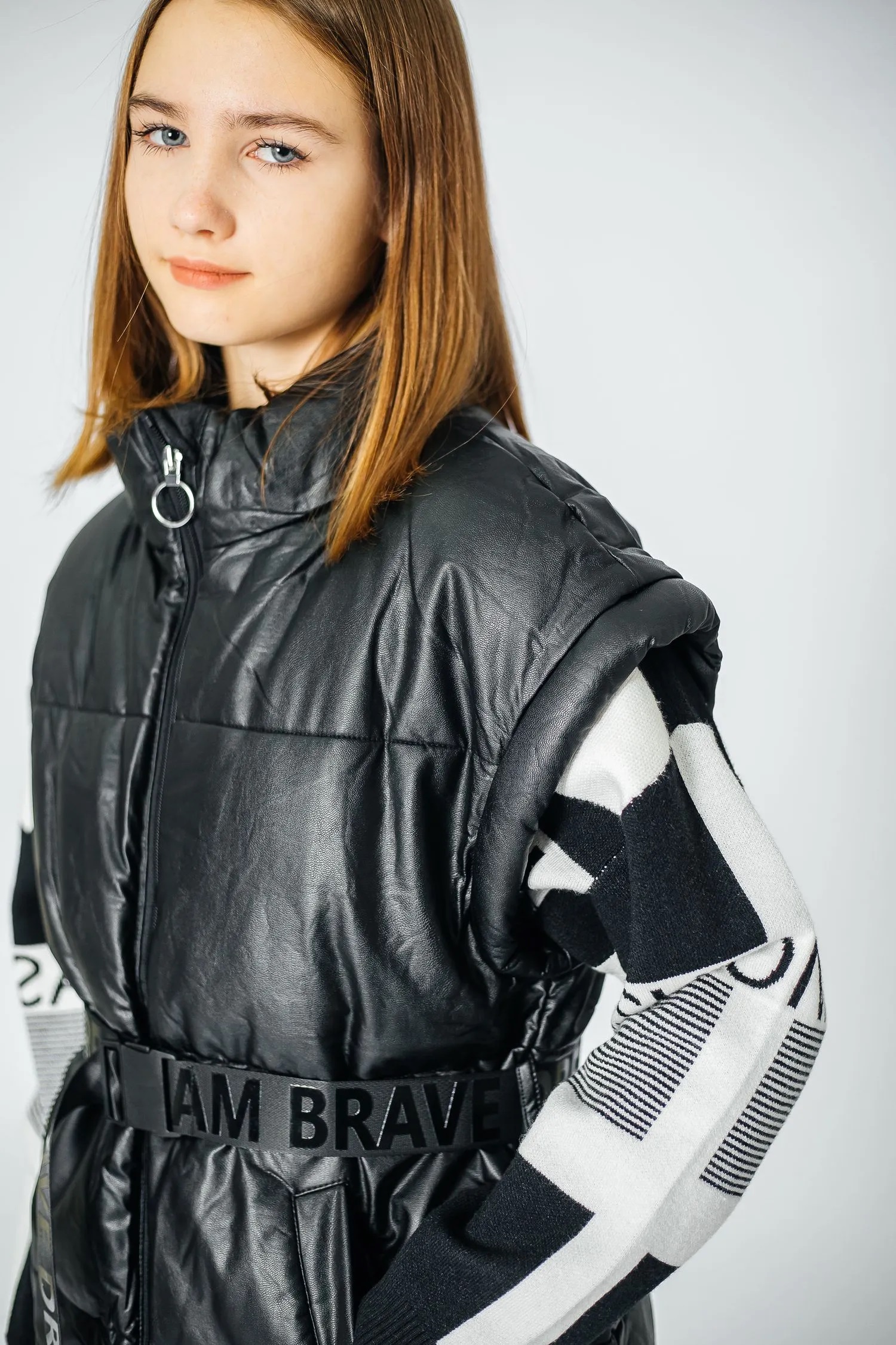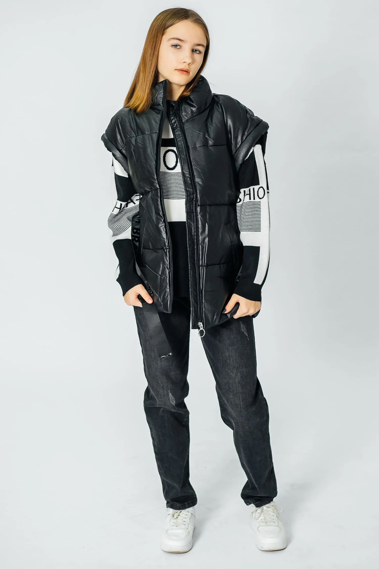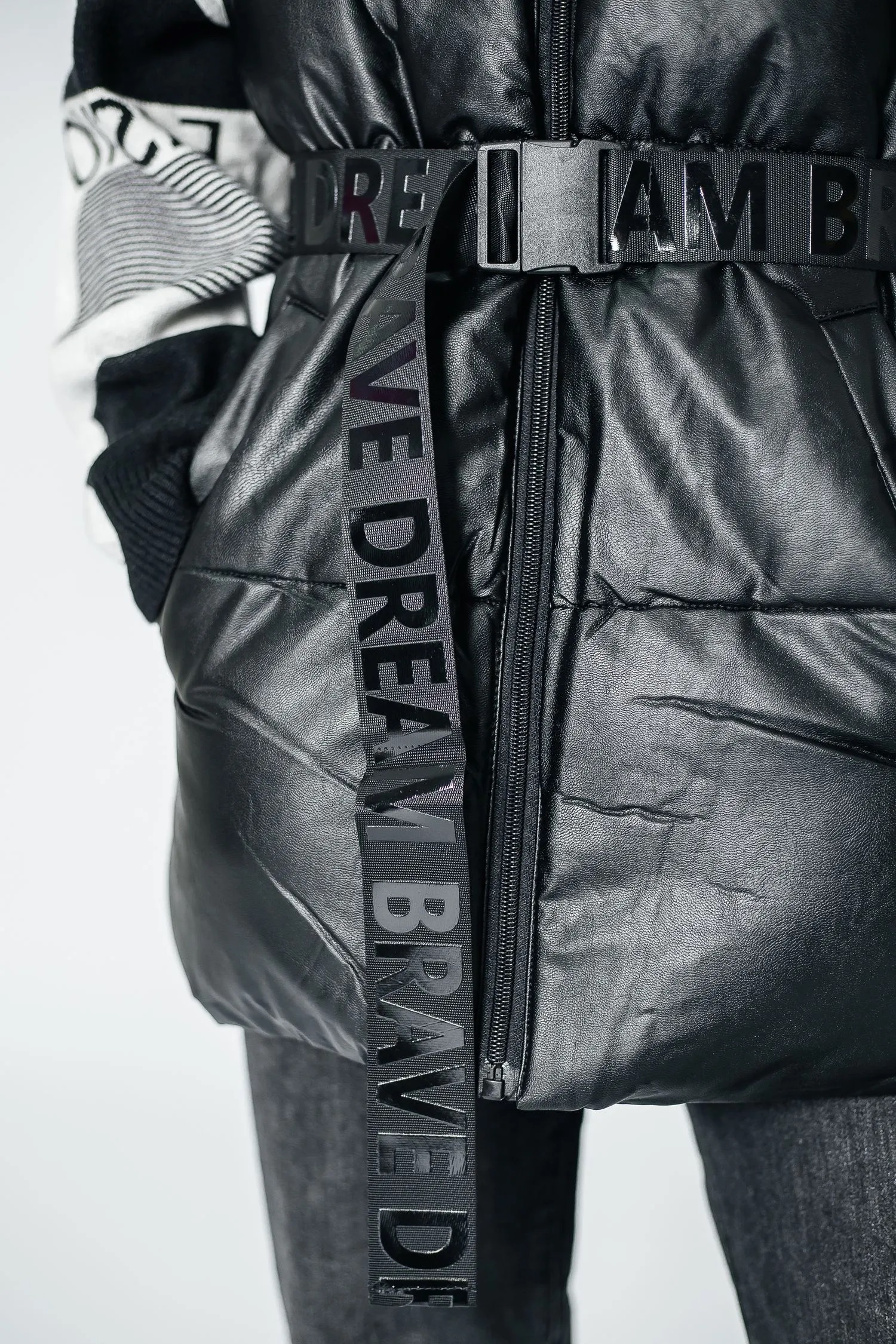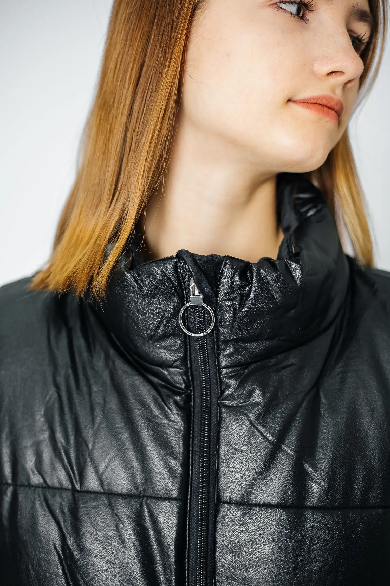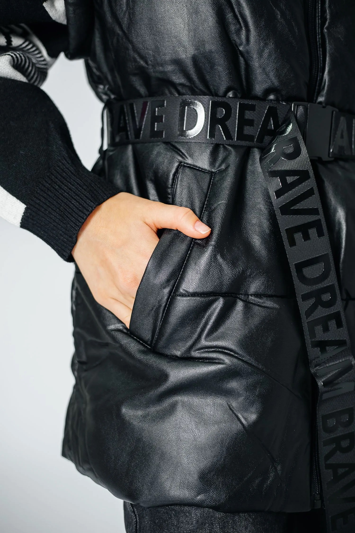 Дутый жилет из кожзаменителя с утеплителем. Имеет приталенный силуэт, есть шлевки и текстильный ремень на талии. Застегивается на молнию. Воротник-стойка достаточно высокий, надежно закрывает шею. Линия плеч – спущенная. Есть два удобных врезных кармана спереди.