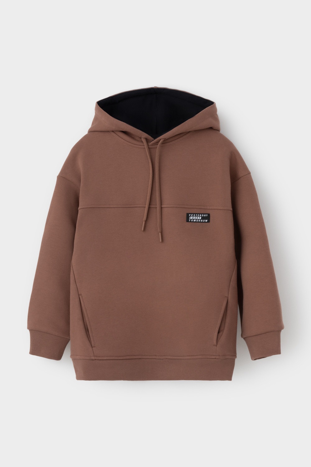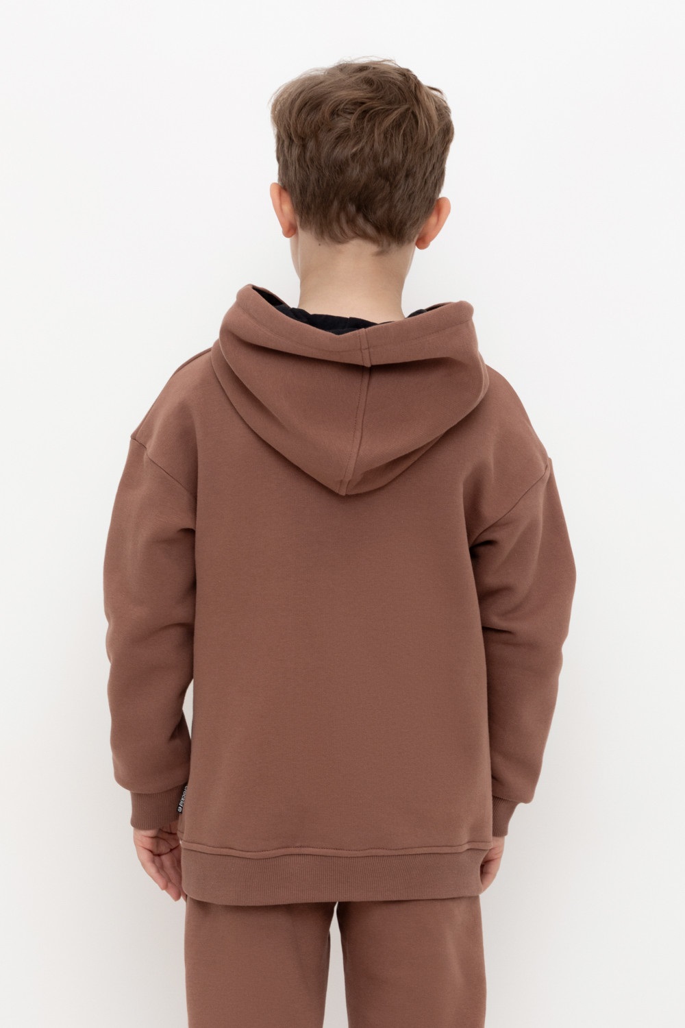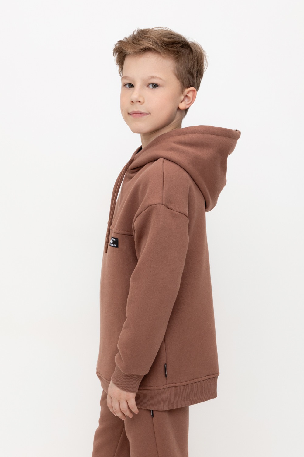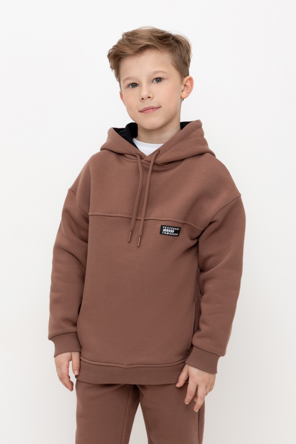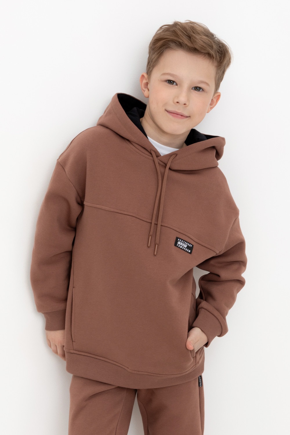 Худи с капюшоном для мальчика из футера трехнитки с начесом. Манжеты и пояс выполнены из эластичного полотна. По бокам карманы с закрепками.