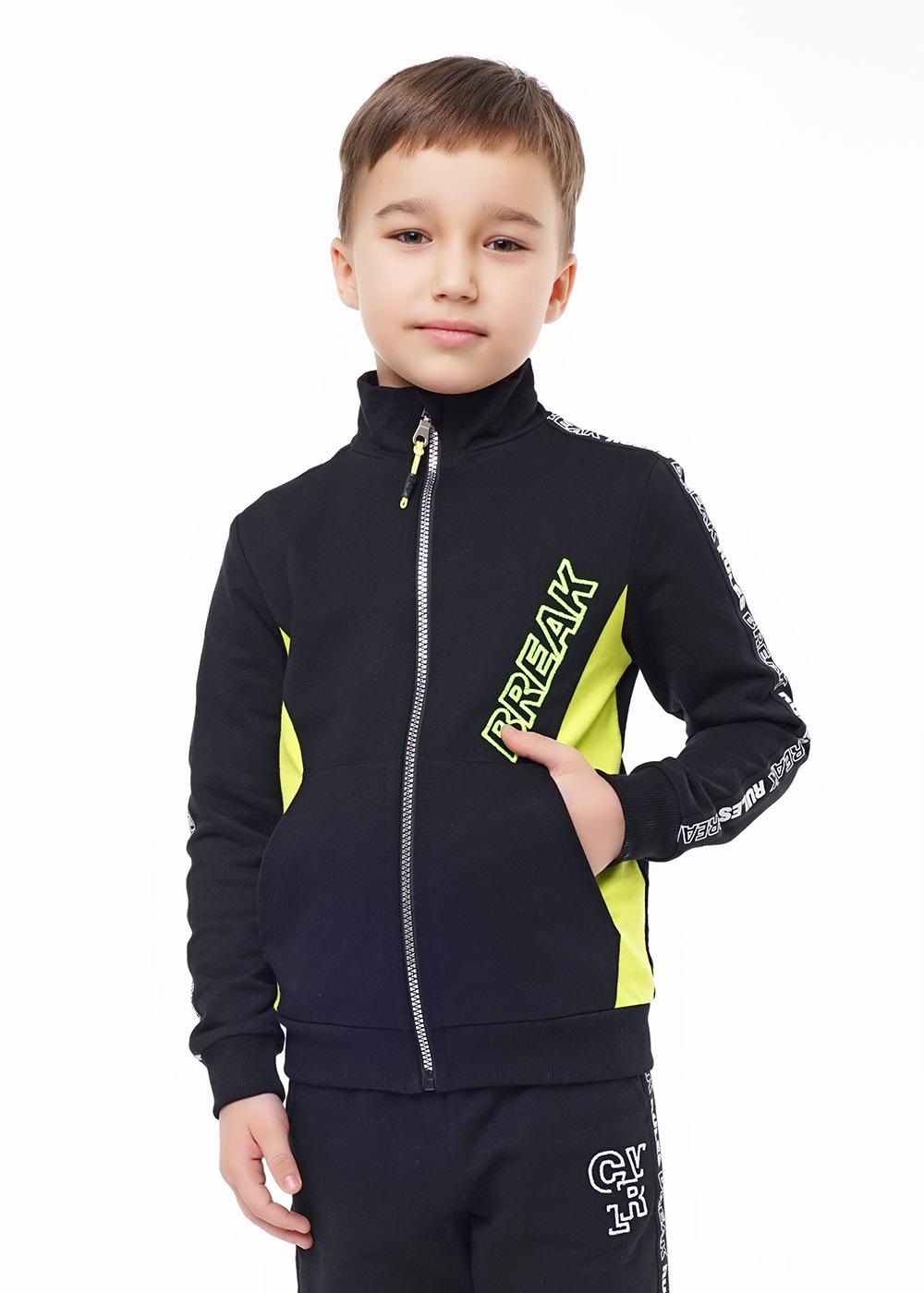 Описание товара: Толстовка без капюшона на молнии из футера без начеса. По рукавам декоративная тесьма. Вышивка на кокетке переда