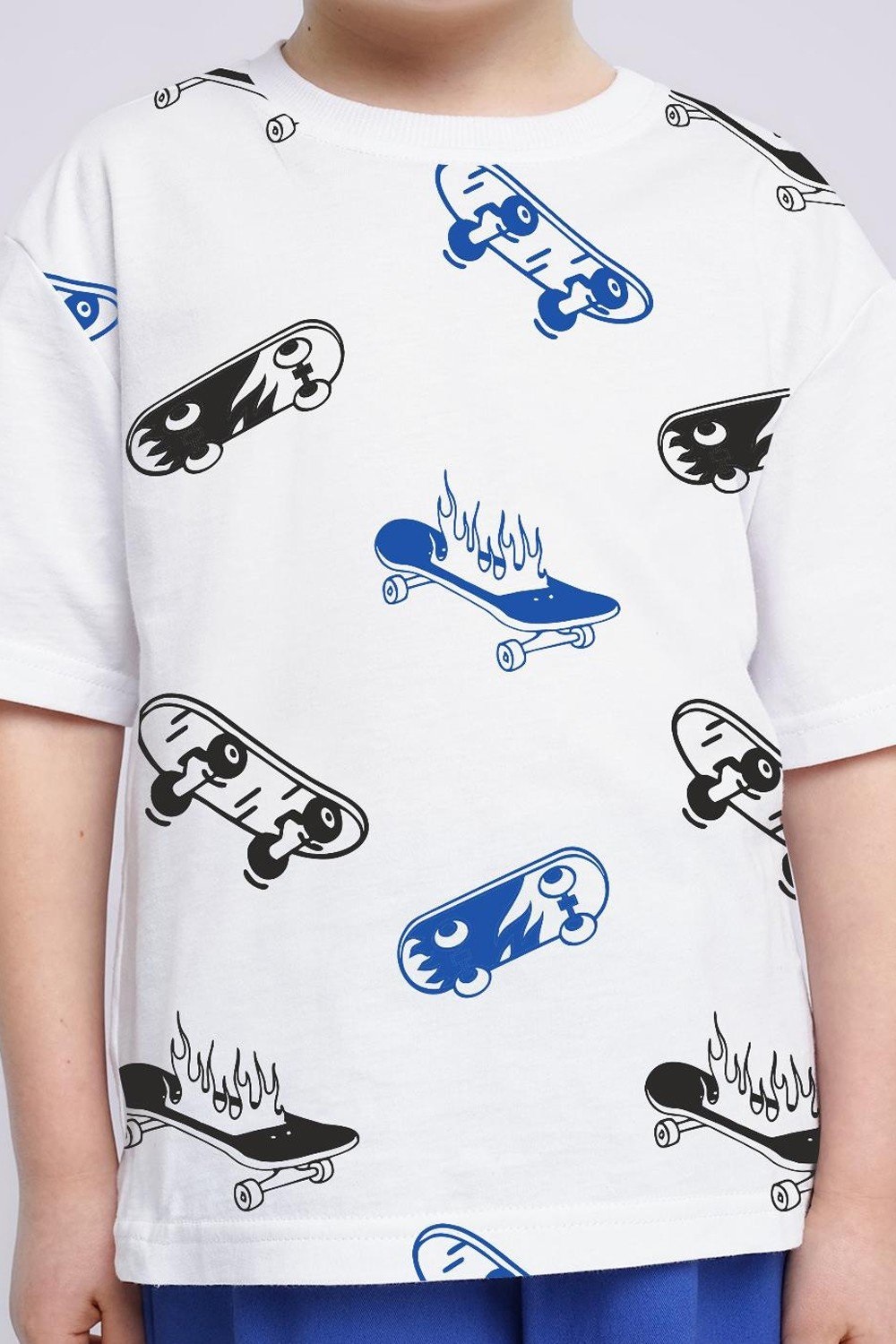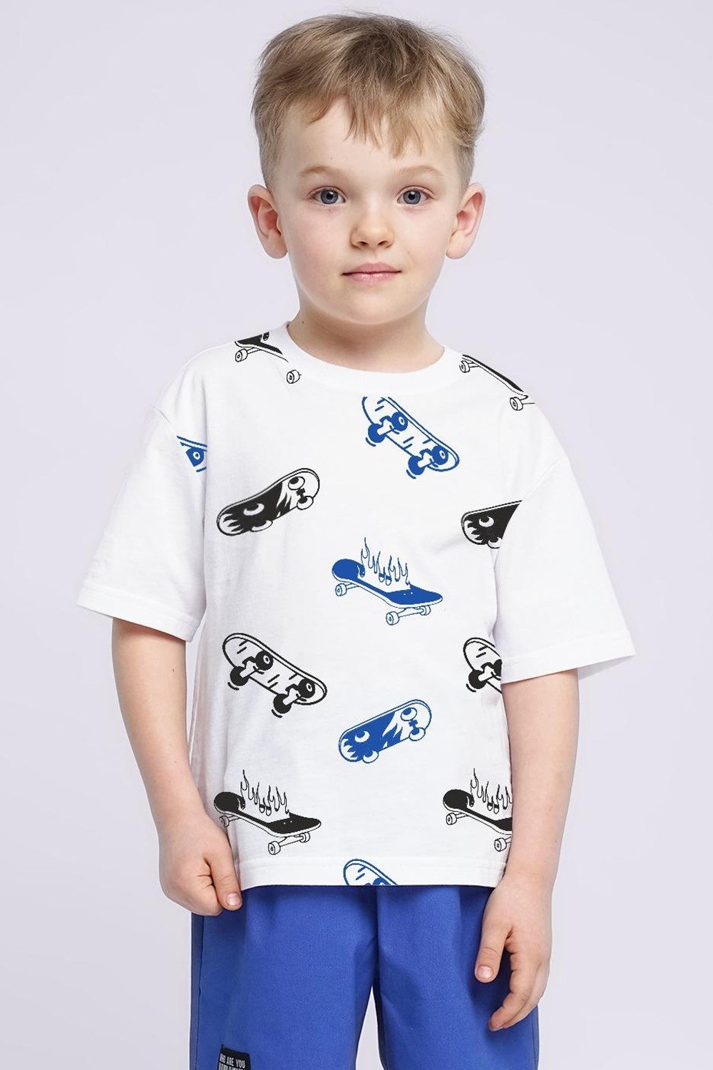 Стильная футболка для мальчика дополнена ярким авторским рисунком скейтборда спереди. Отлично сочетается с джинсами, шортами и летними брюками.