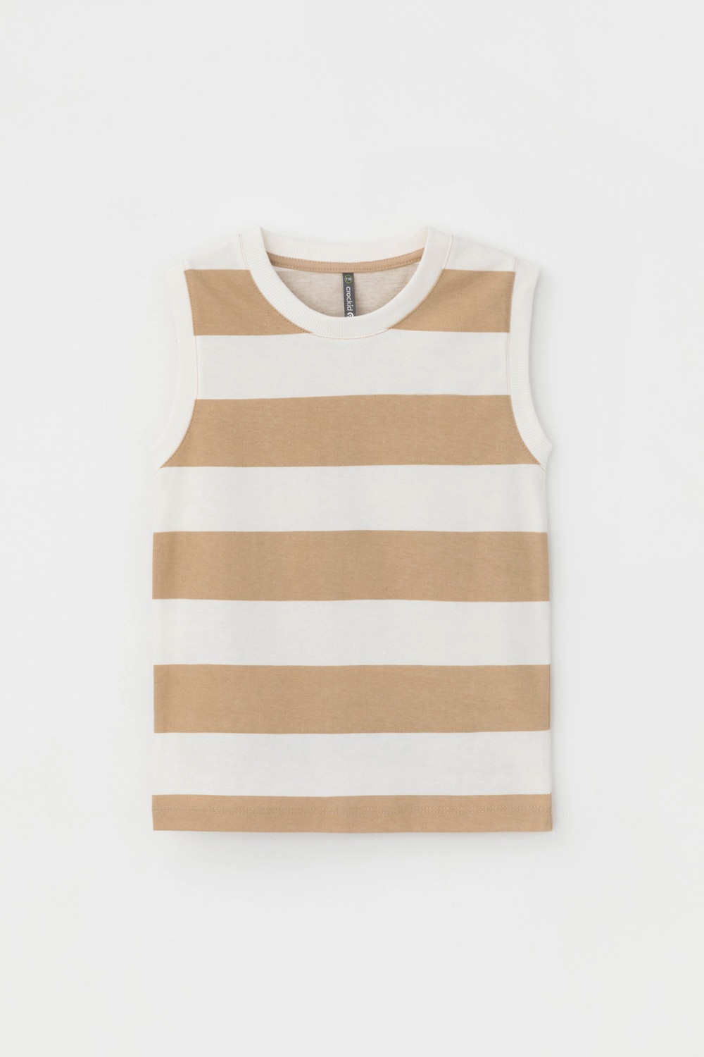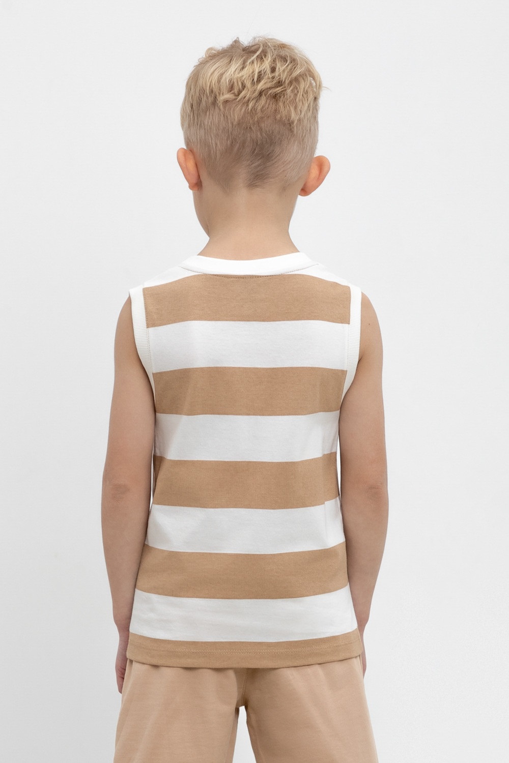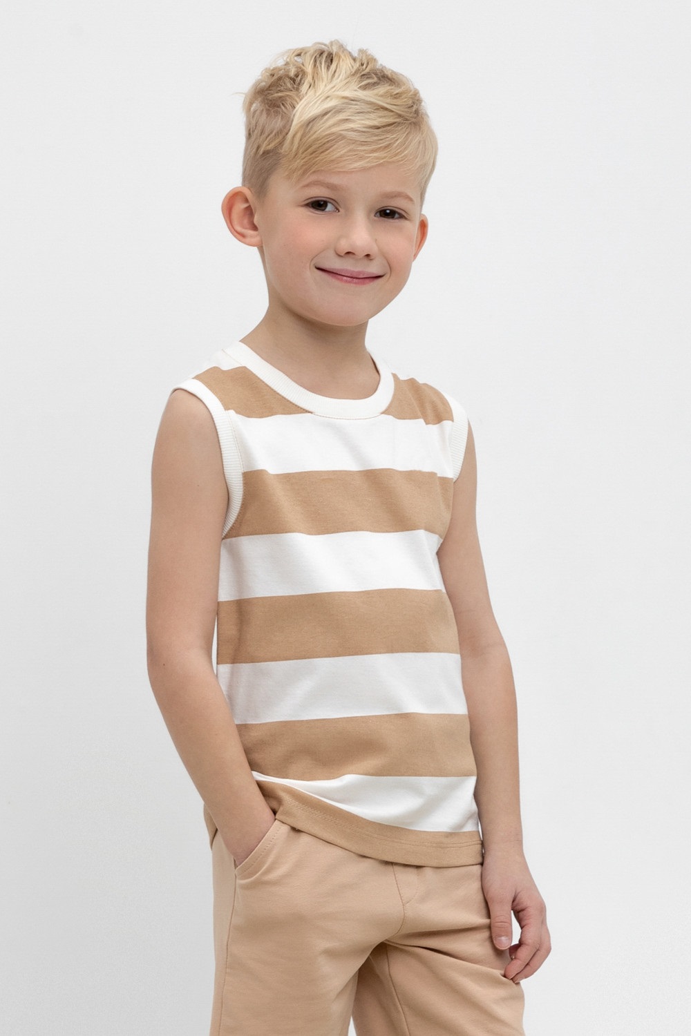 Летняя майка в полоску для мальчика из высококачественного трикотажного полотна. Оригинальная набивка выполнена из стойких текстильных красителей.