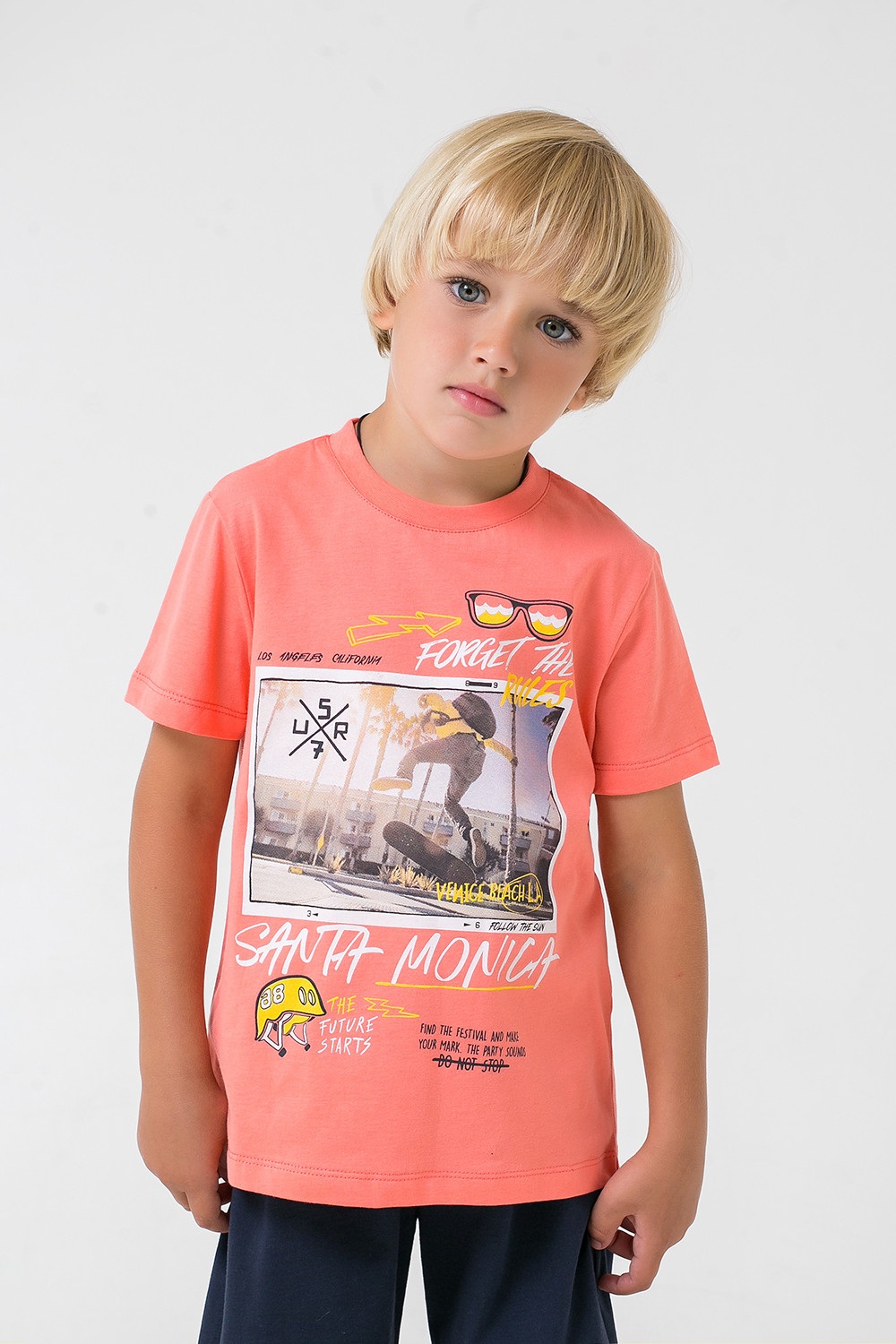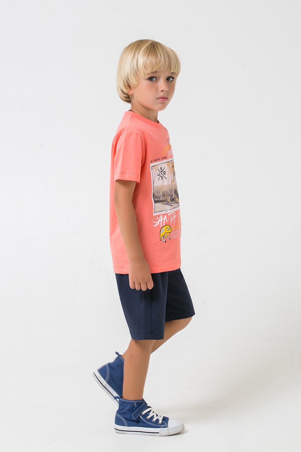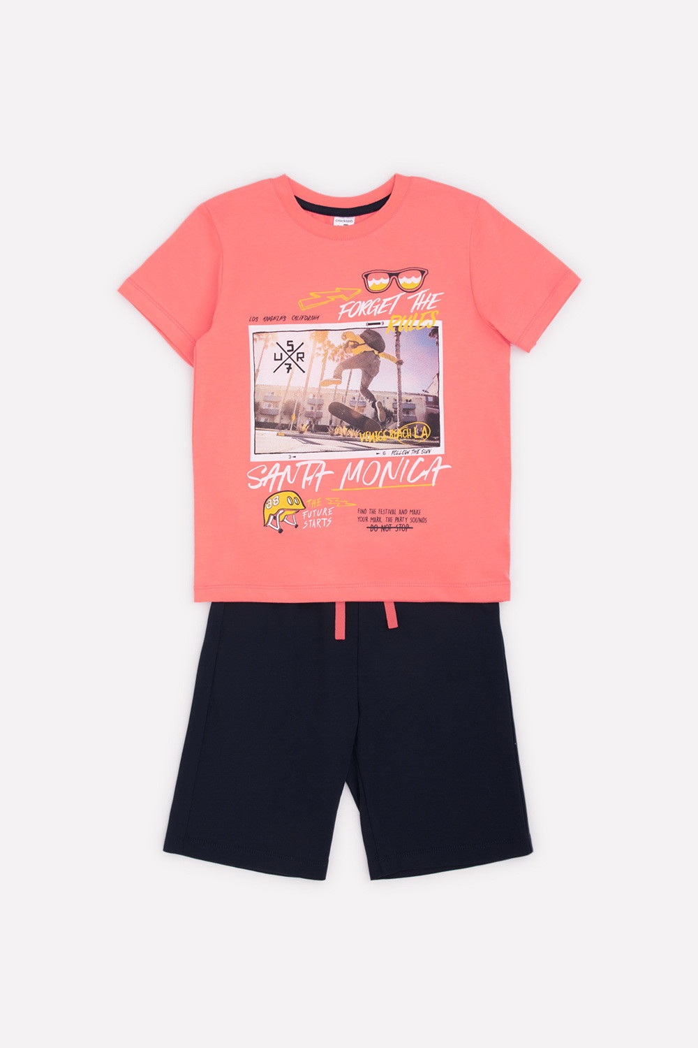 Трикотажный комплект для мальчика из футболки и шорт. Коралловая футболка с короткими рукавами украшена надписями и крупным принтом. Однотонные шорты на резинке регулируются по ширине с помощью ленты.
