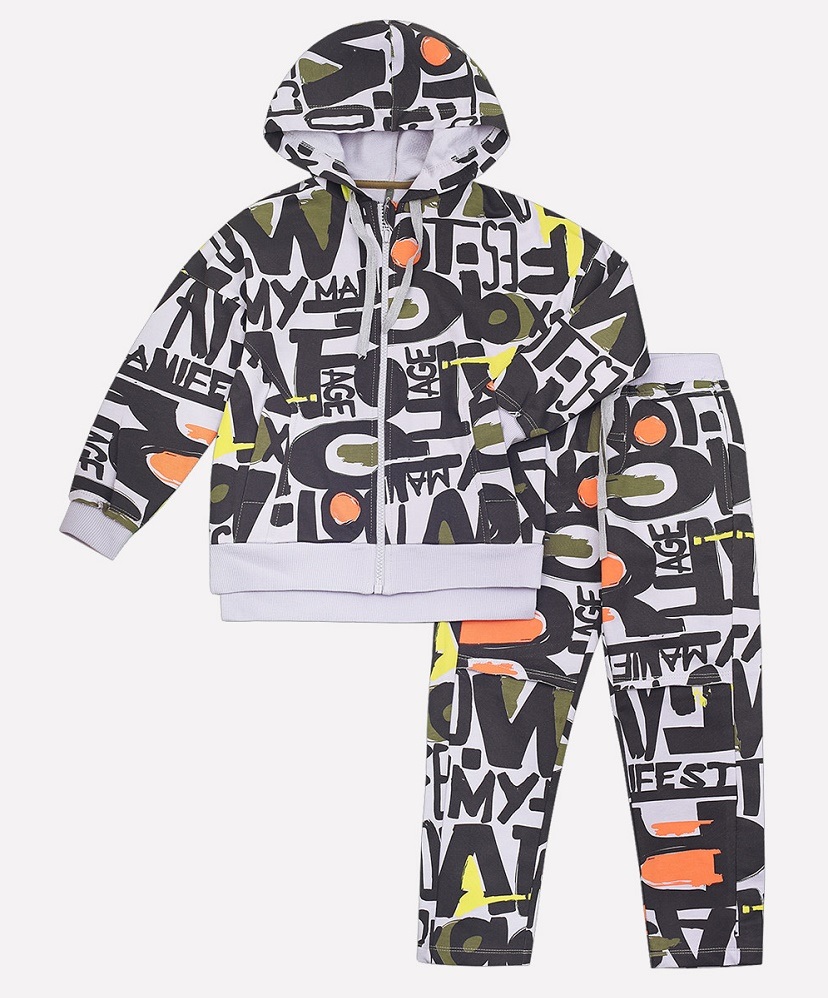 Тип ткани: Футер. Состав: 100% хлопок. Комплект для мальчика Crockid из футера с набивным рисунком. Толстовка с длинными рукавами со спущенным плечом. Капюшон на подкладке из гладкого хлопка. По краю капюшона кулиса со шнуром. Внутренние боковые карманы. Разрезы по низу боковых швов. Спинка оформлена длиннее полочки. По центру застёжка на молнию с защитой шеи. Брюки с внутренними боковыми карманами. В поясе эластичная резинка и шнур. Имитация гульфика. Рельефные манжеты и пояс толстовки и брюк выполнены из хлопка с лайкрой.