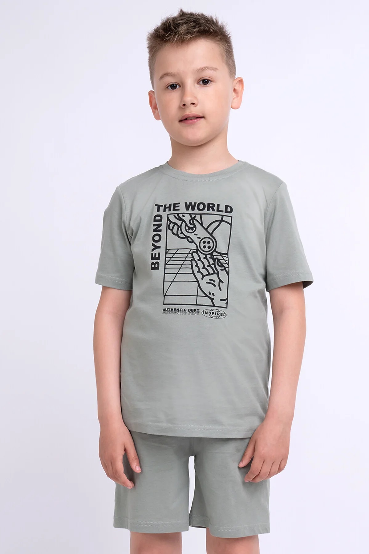 Комфортная пижама из приятного к телу хлопка.Комплект из джемпера с коротким рукавом и шортами выше колена. Горловина с эластичной окантовкой. По верху шорт - эластичная тесьма. Впереди тематический принт