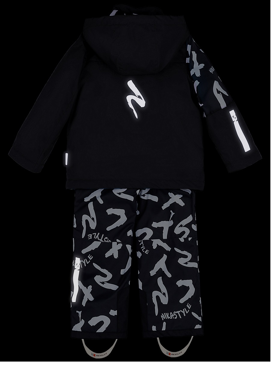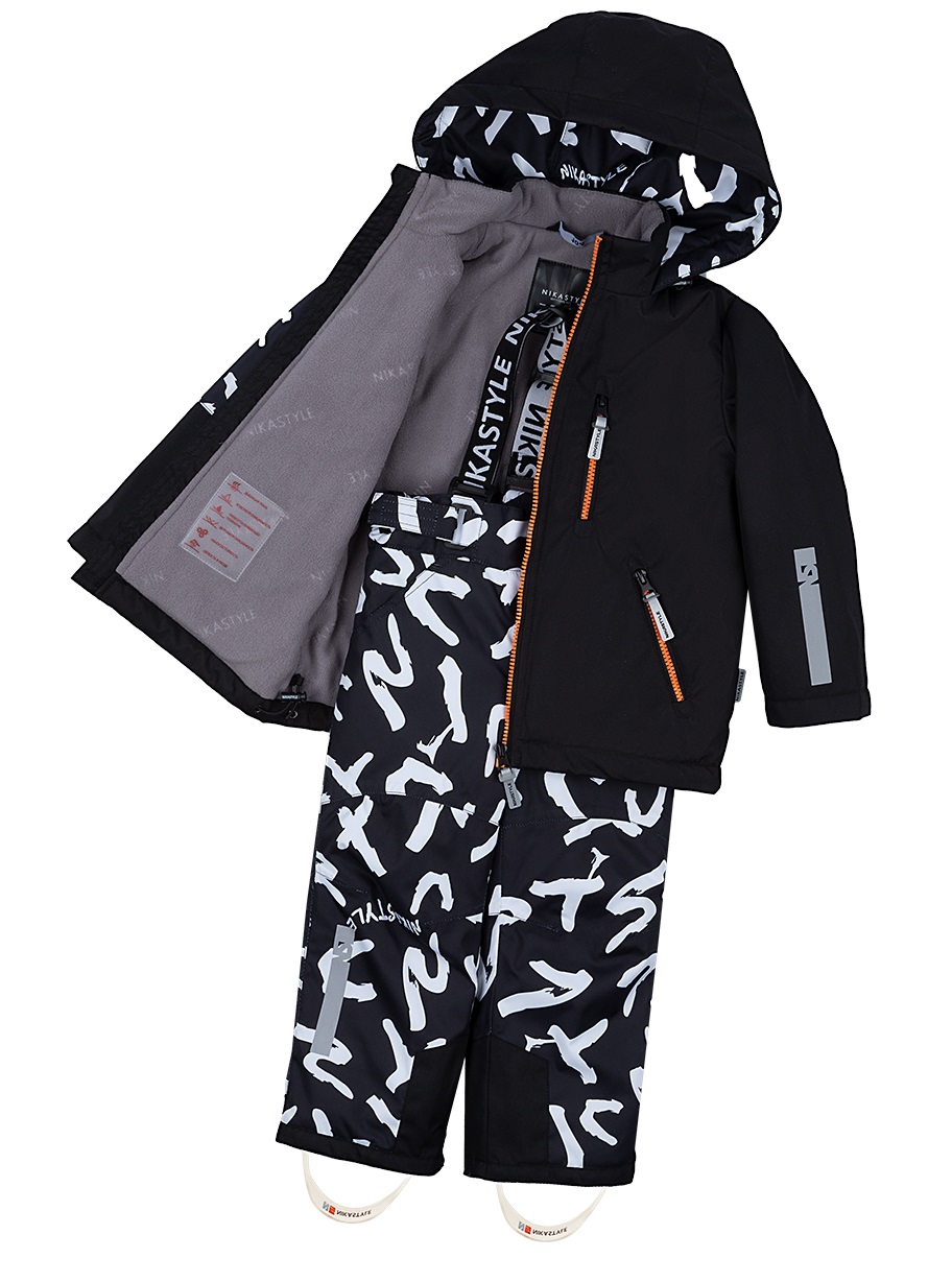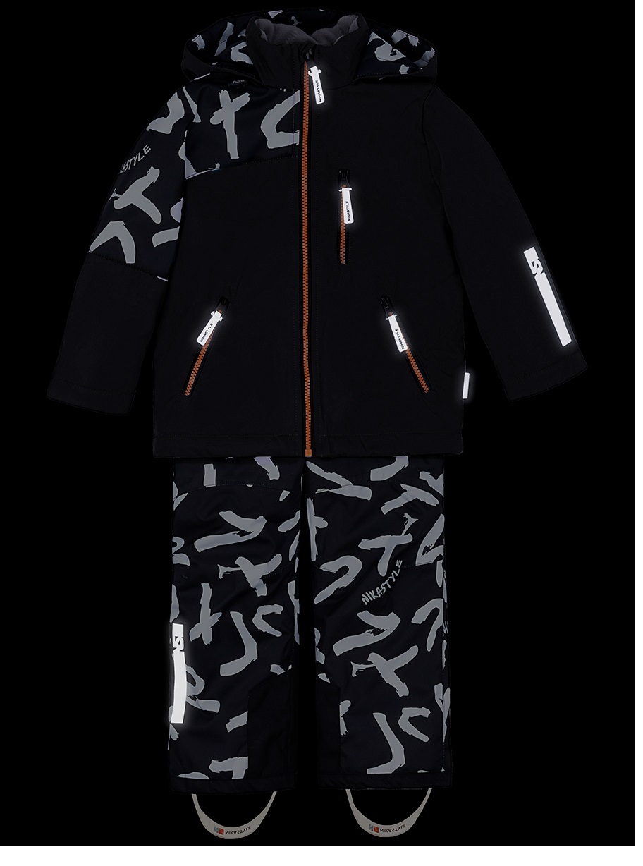 Комплект SYMBOL из мембранной ткани,сочетания однотонной и принтованной. Мембрана отталкивает воду и грязь, защищает от ветра и позволяет коже дышать. Мембрана в сочетании с утеплителем нового поколения fiberlite сохраняет тепло во время прогулок. КУРТКА с центральной застежкой на тесьму-молнию . Внутренняя планка защитит от холодного ветра и непогоды. Капюшон втачной ,с кулисой для регулировки объема. Куртка с тремя карманами на молнии. Рукава с внутренним трикотажным манжетом защищают от проникновения холодного ветра. По низу куртки утяжка для регулировки объема изделия. Подкладка по спинке и полочке из флиса. БРЮКИ из принтованной ткани на регулируемых, съемных бретелях, с дополнительной регулировкой объема по талии, с двумя карманами. Брючины оснащены муфтами и силиконовыми штрипками. Средний шов, шаговый и швы в области колен проклеены. Комплект оснащен светоотражающими элементами для безопасности ребенка в темное время суток. Комфортная температура эксплуатации от -5 до +10 С. Данные носят субъективный характер и зависят от индивидуальных особенностей ребенка. Рекомендуем дополнить образ фирменными аксессуарами - шапкой/балаклавой /комплектом , варежками/перчатками NIKASTYLE, которые отлично сочетаются с изделиями коллекции.