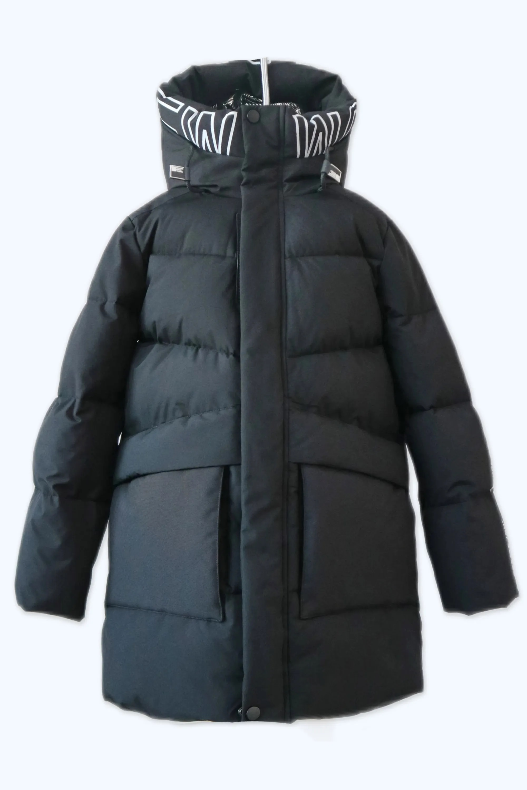Это удлиненная зимняя куртка с прямым кроем. Вшитый капюшон с утяжками защищает голову от холодного ветра, а объемные буквы на капюшоне добавляют стильности и индивидуальности.