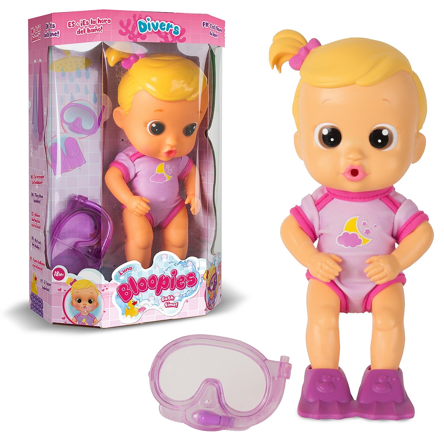Милые малыши Bloopes (Луна) Луна - прекрасный "пловец", поместите её в воду, нажмите на её животик, вода наберется, затем повторно нажмите на живот и Луна начнет брызгаться водой изо рта, а если надеть маску, то через трубку в маске. Поместив малыша в воду с пеной, и проделав все тоже, что и в обычной воде, Луна будет пускать пузыри. В наборе - Кукла ПВХ - Маска - Ласты Внимание! Костюм у куклы не снимается! Размер куклы 24см Для работы батарейки не требуются