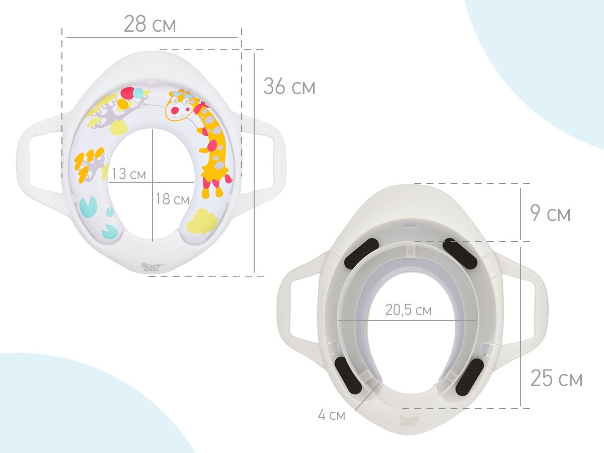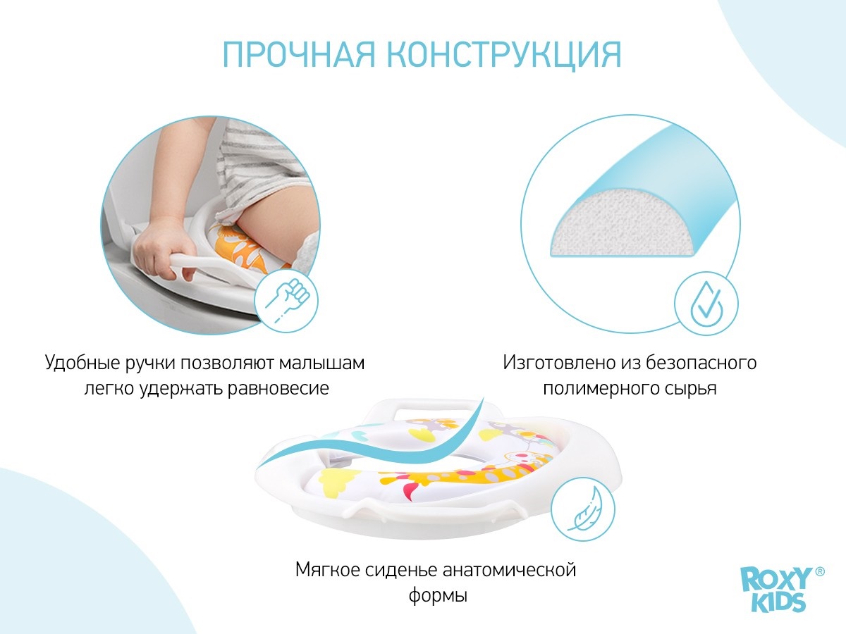 Сидение для унитаза ROXY-KIDS с ручками в стороны поможет малышу привыкнуть ко взрослому туалету и обеспечит крохе необходимый комфорт. Адаптер имеет удобную анатомическую форму, мягкое сидение и ручки, за которые удобно держаться. Устройство легко моется и подходит для большинства современных унитазов. Рекомендуем перед покупкой сверить размеры вашего унитаза и размеры адаптера для проверки совместимости. Изготовлено из безопасного полимерного сырья. Обращаем ваше внимание, что оставлять ребенка на унитазе без присмотра не рекомендуется. В ассортименте ROXY-KIDS представлено несколько накладок для унитаза с различными дизайнами.
