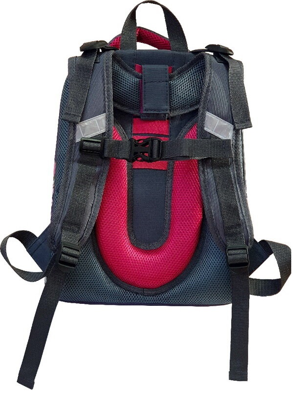 Ранец изготовлен из формованного EVA-материала и высокопрочного непромокаемого полиэстера. Размер 30 х 38 х 16 см. Вес 900 г. Прочные формованные стенки и дно ранца позволяют надежно защитить содержимое от влаги, загрязнений и предотвращают его замятие. Ранец с двумя вместительными отделениями, закрывающимися на реверсивную пластиковую молнию с металлическими «бегунками»; в первом — «плавающие» перегородки для тетрадей и учебников, во втором – большой карман из сетки и карманы-органайзеры для канцелярских принадлежностей. Плотная спинка с анатомическими элементами дополнительно укреплена пластиком, сверху – дышащая трехслойная сетка. Лямки-маечка плотные, мягкие. Регулируются по длине и высоте, что позволяет без труда отрегулировать их по росту ребенка. Ранец снабжен надежным нагрудным фиксатором. Есть удобная мягкая ручка для переноски и дополнительная петлевая ручка для размещения ранца на крюке. На дне ранца есть две пластиковые ножки. В соответствии с требованиями к безопасности на дороге, ранец имеет светоотражающие элементы на лямках и корпусе.