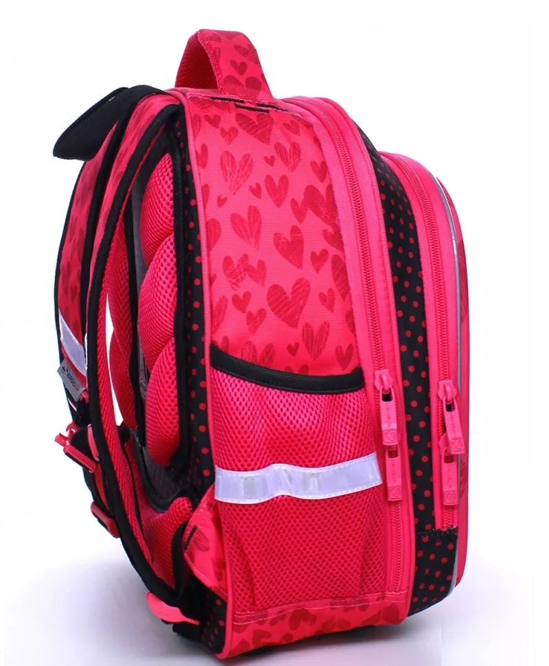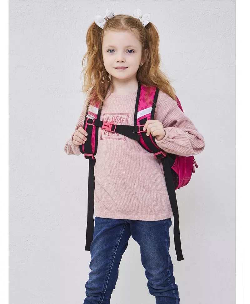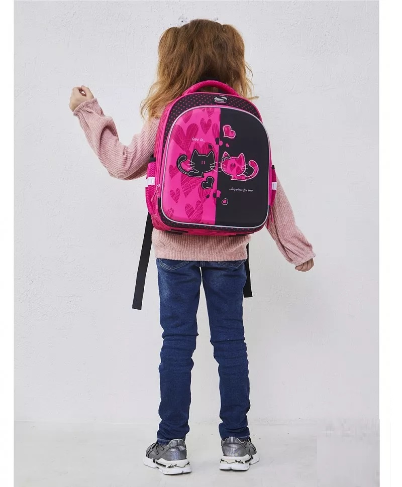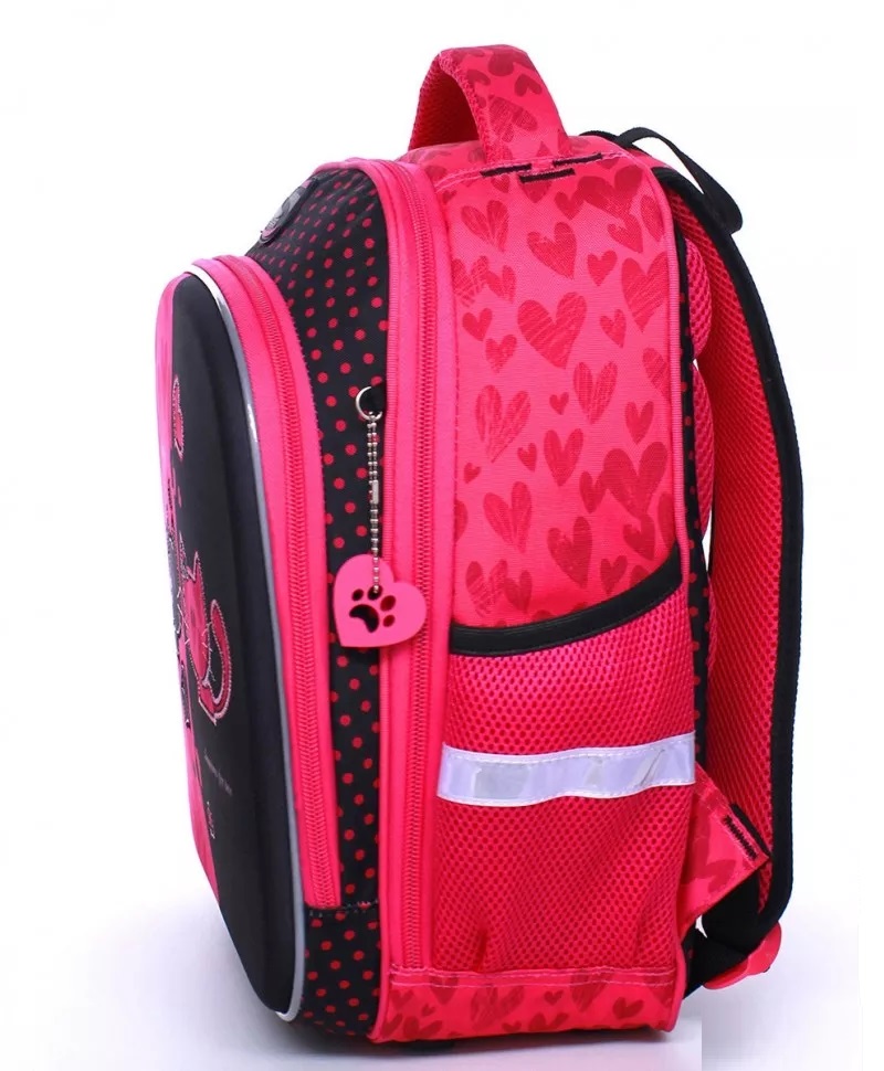 Комплектация рюкзака – ранца: большое отделение для тетрадей, учебников и папки А4. Переднее отделение с удобным органайзером и карманом для телефона. По бокам расположены сетчатые карманы под бутылочку с водой. Дополнительный подарок – резиновый брелок, повторяющий дизайн самого ранца.