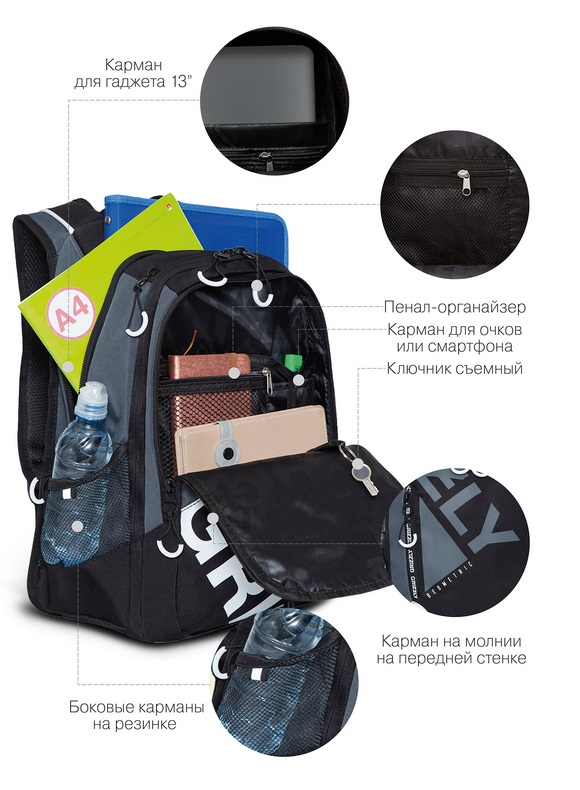 В рюкзаке 3 основных отделения: для книг или крупных вещей; для тетрадей, папок и документов (А4); для принадлежностей. Внутри мы сделали 5 карманов (есть открытые и на замке), карман для ноутбука 13” и брелок для ключей. Есть 4 внешних кармана и 2 боковых сетчатых: для воды и ланч-бокса. Вещи лежат на своих местах, и вы не ищете их по дну рюкзака.