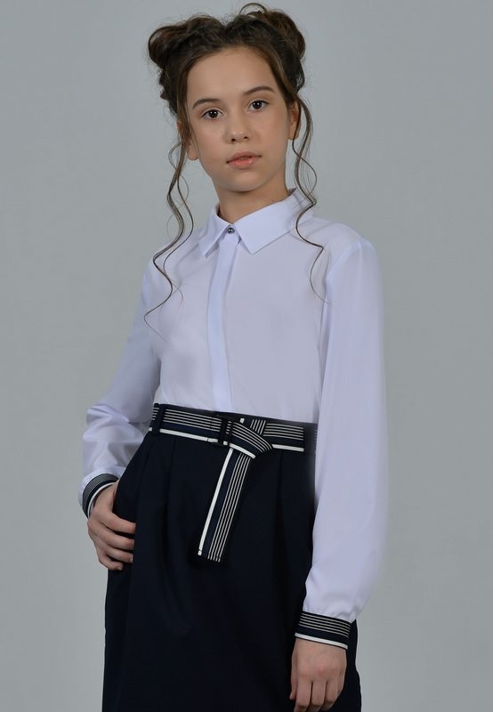 Классическая блузка для девочки прямого силуэта с удлиненной спинкой. Отложной воротник. Длинный рукав на манжете декорирован широкой тесьмой.